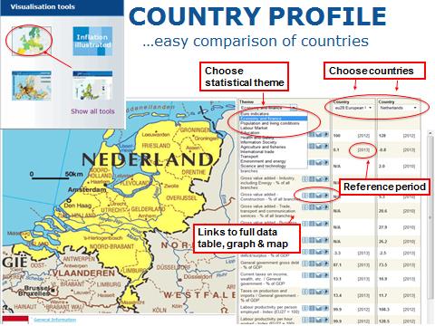 3. Eurostat biedt een aantal visualisation tools aan om snel data te bekijken en te vergelijken. Een voorbeeld is het landenprofiel, waarmee je per land de belangrijkste indicatoren kan vinden die je meteen kan vergelijken met de Europese gemiddelden of de cijfers voor een specifiek land. Bij alle indicatoren hoort ook een link naar de volledige datatabellen.