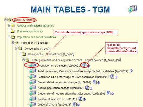 4. Kant en klare tabellen met de meest gezochte data. Wanneer je zelf niet zo handig bent om te zoeken in de volledige Eurostat-databank, kan je gebruik maken van hoofdtabellen, waarin de meest relevante gegevens op een overzichtelijke manier worden weergegeven. Je kan scrollen door de beschikbare hoofdtabellen via een uitklapmenu (zie onder). De gegevens kan je vervolgens bekijken als tabel of grafiek en je kan ze ook downloaden in allerlei formaten zoals o.a. Excel.