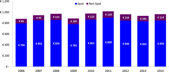 De uitgaven aan televisiereclame hebben zich het afgelopen jaar goed hersteld. In 2014 werd netto 964 miljoen euro aan tv-reclame uitgegeven, een stijging van 3,3 procent. Er werd 850 miljoen uitgegeven aan spot (daadwerkelijke tv-reclame) en 114 miljoen aan non-spot zoals billboards, product-placement en programmasponsoring. SPOT, het Nederlandse marketingcentrum voor televisiereclame, maakt melding van de positieve ontwikkeling in de dinsdag gepubliceerde jaarcijfers. SPOT verwacht, met het oog op een aantrekkende Nederlandse economie, dat de televisiebestedingen in dit jaar met nog eens 2 tot 3 procent zullen toenemen. Opvallende groeicijfers werden behaald in advertenties op online video platforms. Hoewel het aandeel met 21 miljoen euro nog bescheiden is, gaat het in praktische zin om een explosieve groei over 2014 van maar liefst 70 procent. Overigens trekt ook de markt voor radioreclame weer aan: de netto-uitgaven daar stegen met 2,8 procent naar 233 miljoen euro. Meer bij SPOT