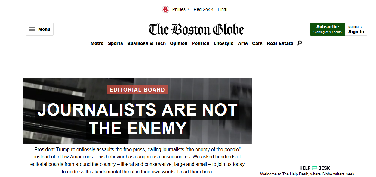 Leek het er eerder deze week nog op dat zo'n 100 kranten in de Verenigde Staten mee zouden doen, het werden er vandaag 350. Zij plaatsten een redactioneel met de strekking 'journalisten zijn niet de vijand'. Een boodschap duidelijk bedoeld voor de Amerikaanse president Donald Trump die dat keer op keer beweert.
