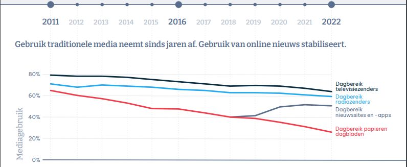 Uit de Mediamonitor 2023 (.pdf) blijkt dat het gebruik van de televisie- en radiozenders en papieren dagbladen weer verder daalt. “Jongeren maken vooral gebruik van sociale media, ook voor nieuws. We zien daarbij in het geval van lineaire televisiezenders dat het gebruik niet toeneemt als de gebruiker ouder wordt. Dat jongeren steeds minder gebruikmaken van traditionele media is dan ook geen leeftijdseffect te noemen, maar een generatie-effect.”