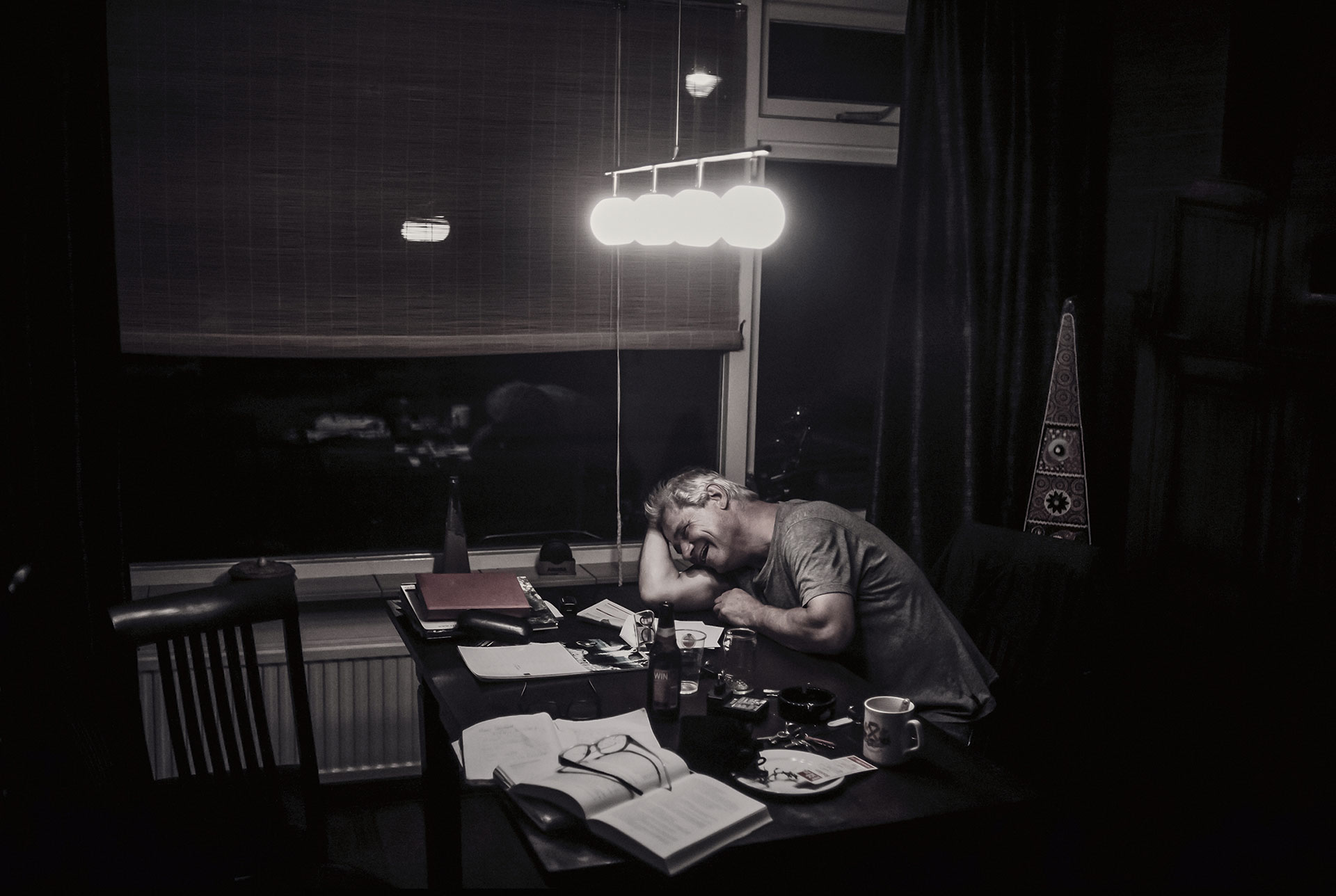 Na ruim twee uur praten strekt de fotograaf zijn rug. Het was hem een genoegen, maar het is tijd om te gaan. Voor de zekerheid kijkt hij nog eens langs me heen. ‘Ik kan het nu vertellen. Wat ik achter je zag’, zegt hij ontspannen. ‘Rondom een tafel middenin de zaak zaten mannen van vermoedelijk Oost-Europese afkomst. Ze waren mooi fout gekleed en spraken op zachte toon. Aan tafeltjes eromheen zaten stevige mannen, lijfwachten. Het leek op het beklinken van een drugsdeal. Ik zag de onderwereld. Maar misschien was het verbeelding.’