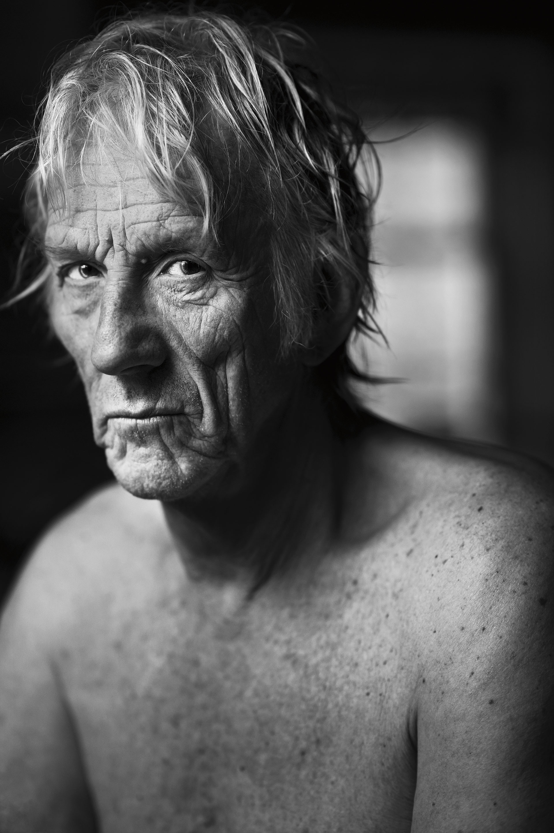 Hij pakt zelf de draad van het interview op. Bij de intimiteit, de inhoud, hoort een stijl. Concessie vindt hij een vreselijke woord, zegt hij. Zijn stijl is vast, simpel en sober. Ja, het zijn nogal zware portretten. Niet alle opdrachtgevers zitten erop te wachten, maar hij blijft ze maken. ‘Die beelden zijn van mij. Kwetsbare mensen die je kwetsbaar aankijken.’ Zeker in het begin, toen hij stage liep bij Het Parool, ondervond hij ook weerstand. Ik vind het mooi, dus iedereen vindt het mooi, zo naïef was hij. ‘Ik kwam van een koude kermis thuis. Het wordt gewaardeerd wat ik maak of ze vinden het afschuwelijk. Mijn foto’s roepen iets op. De kijker wordt geconfronteerd met een onverwacht beeld, iets wat ze niet willen zien.’