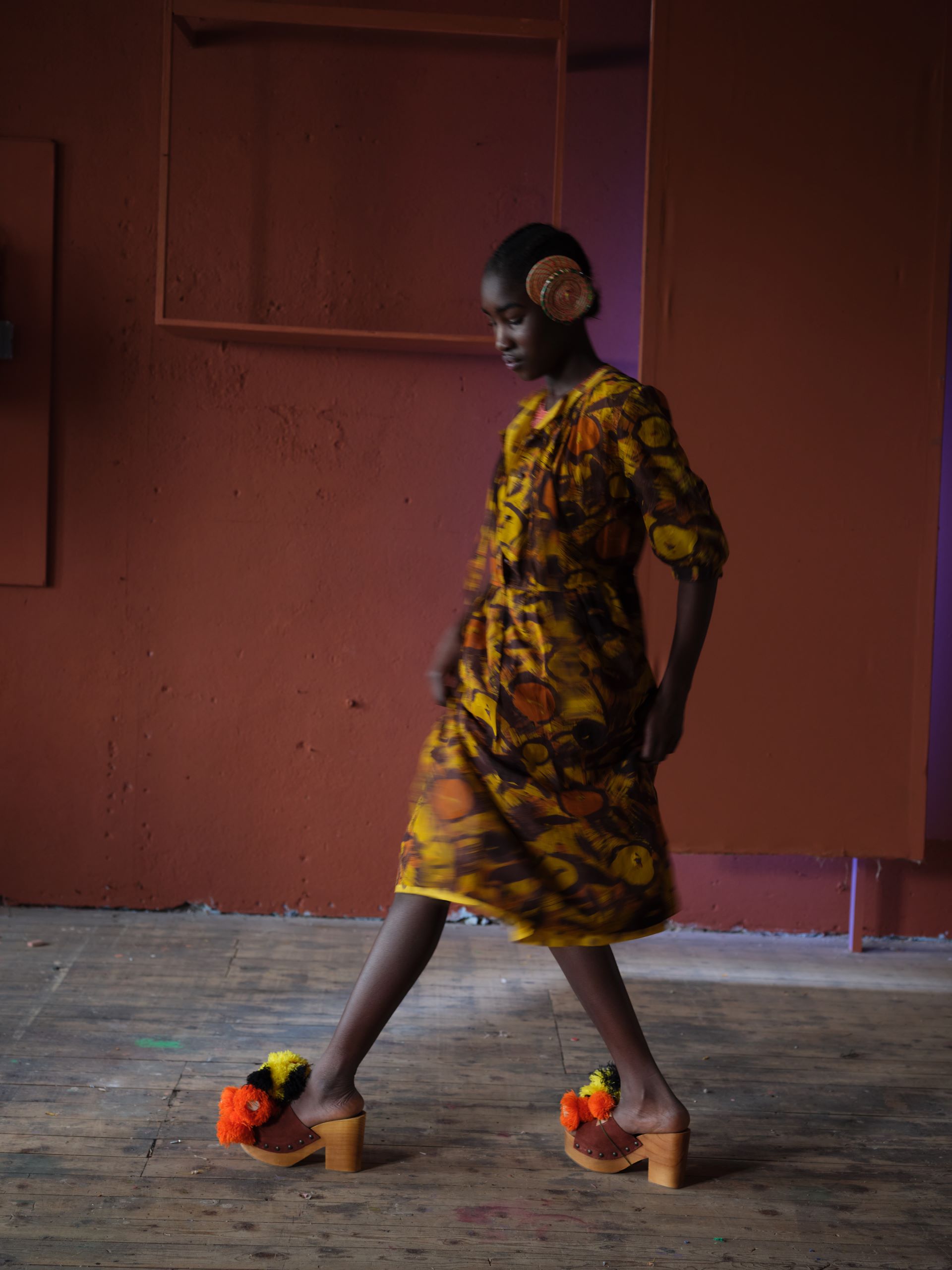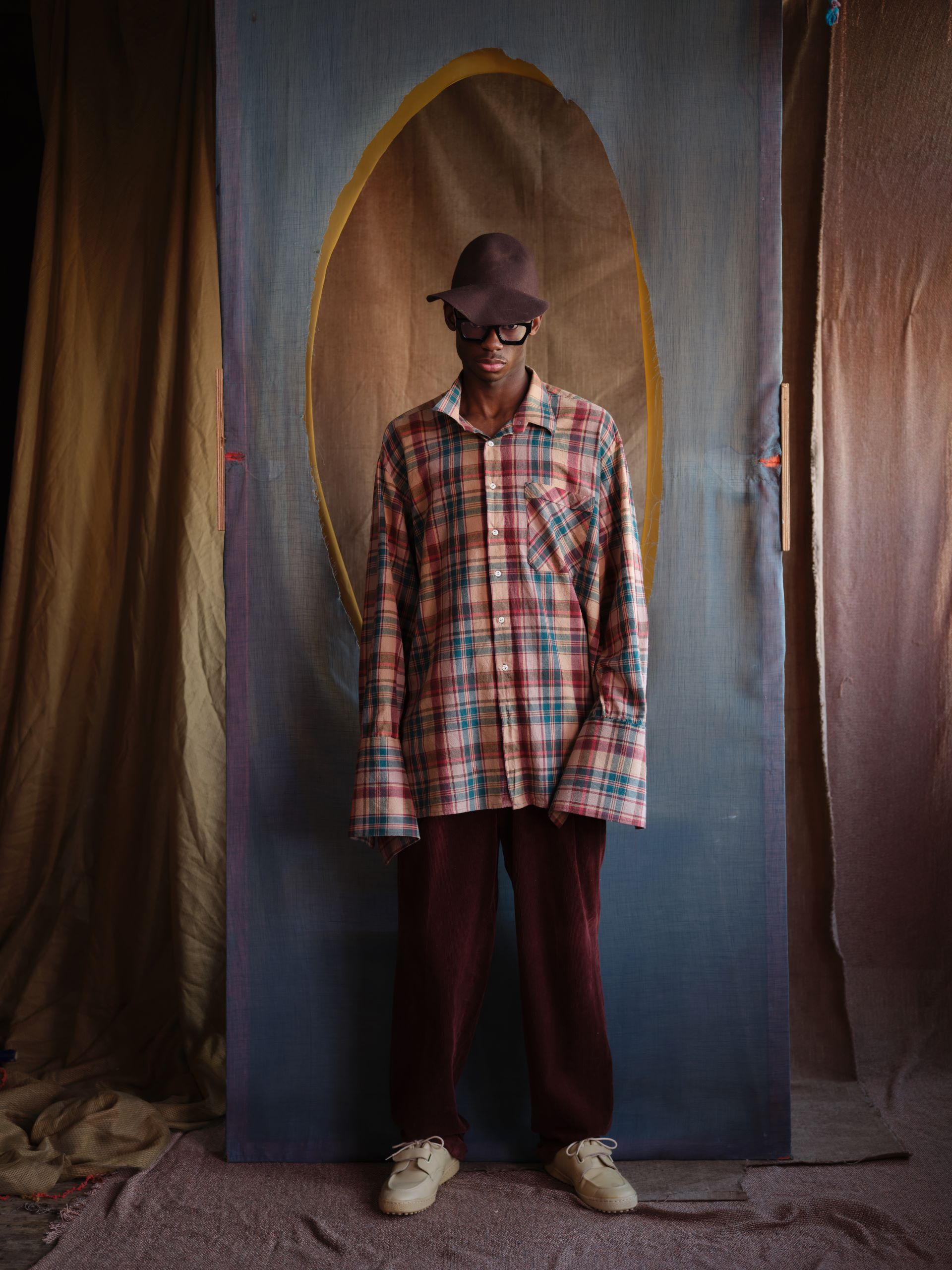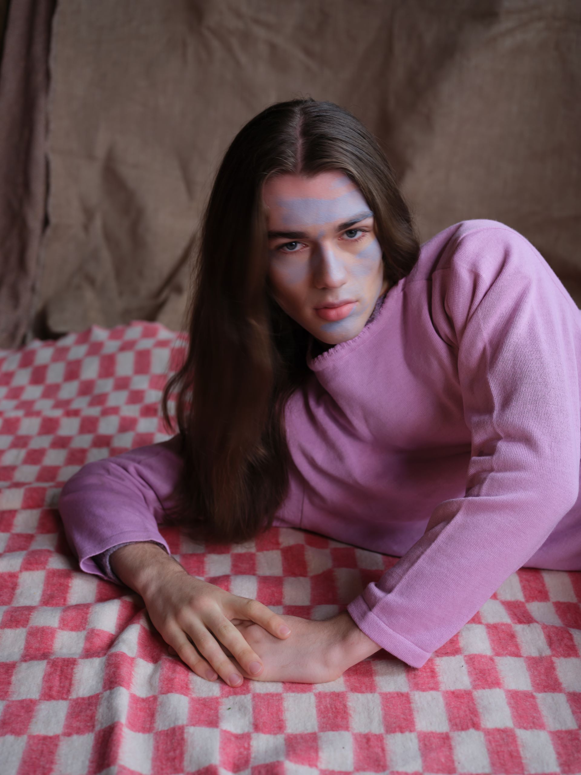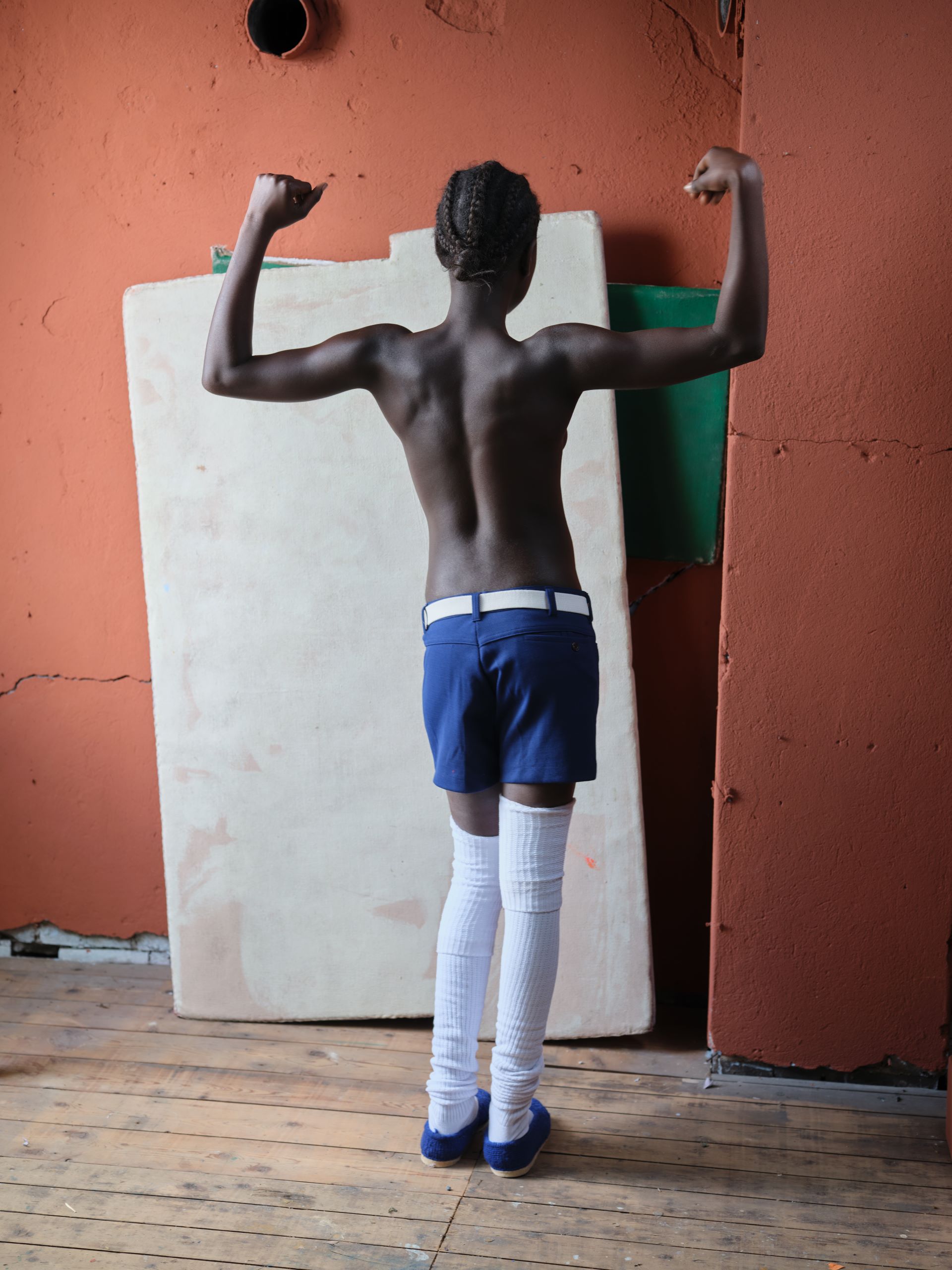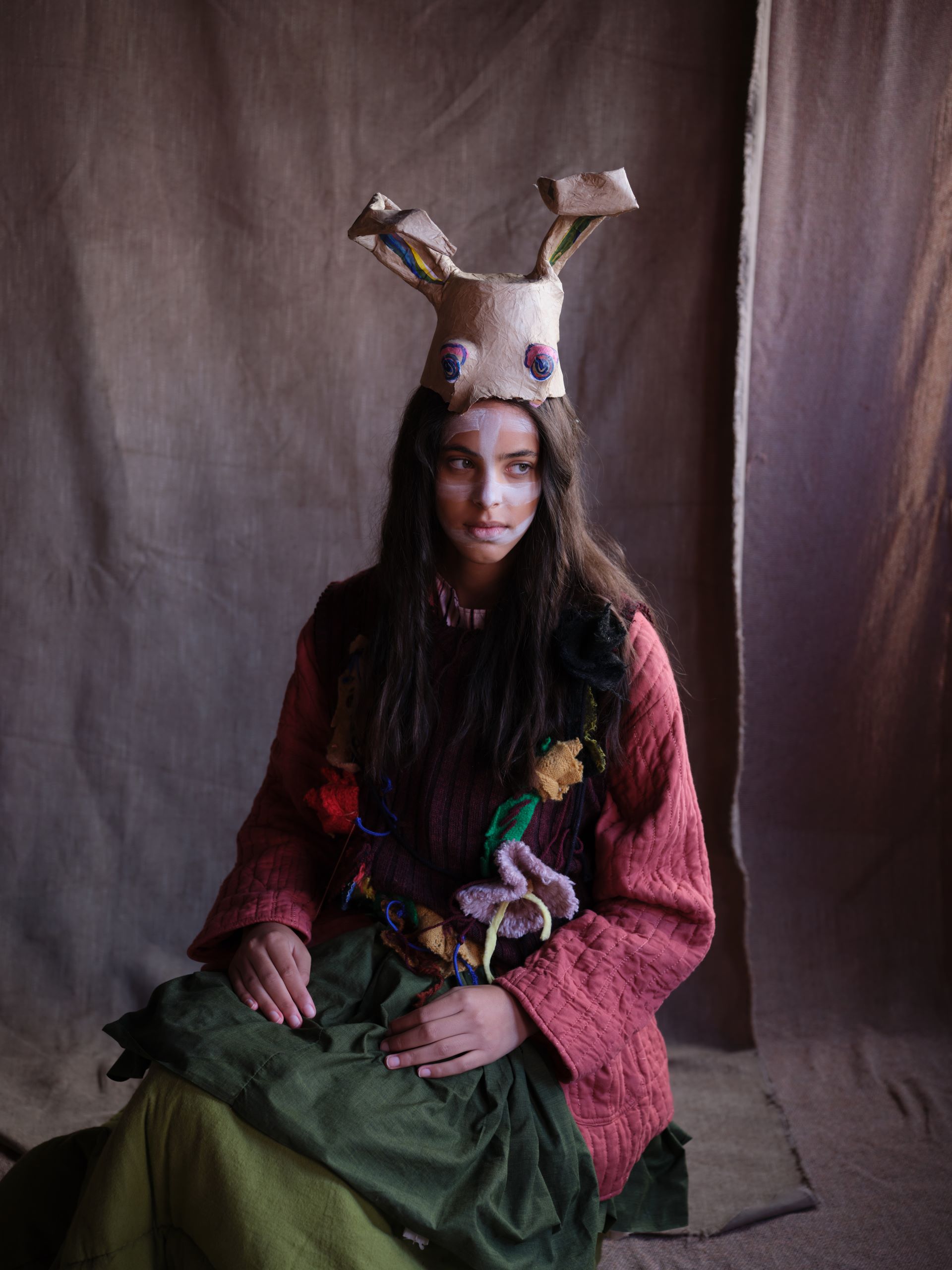 ‘Met modellen zoals Sem zijn we de studio ingegaan. Frank en ik willen iets doen met folklore en het verdwijnen van bepaalde waarden, maar dat thema zit er nu nog heel licht onder. Het project is net begonnen en gaat nu vooral over vormen en kleuren. Waar het precies naartoe gaat is onduidelijk, maar deze foto (pagina 43) is een mooi uitgangspunt.’