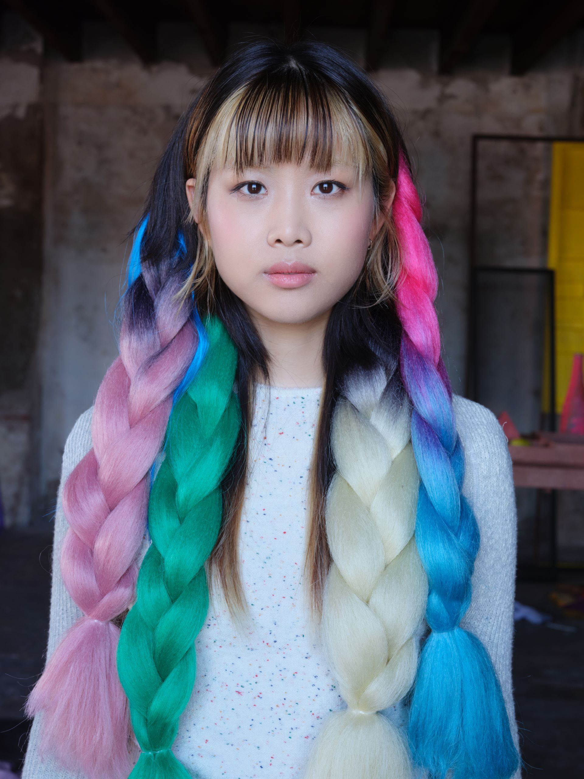 ‘Ik was voor een shoot op de Koninklijke Academie voor Beeldende Kunsten in Den Haag en in de gang liep Jiyun voorbij. Ze had allemaal vlechten in haar haar en zag er fantastisch uit. Even liep ik door, maar na een paar seconden ben ik toch achter haar aangerend om te vragen of ze model wilde staan. Ze is zo’n opvallende verschijning. Jiyun is heel erg met haar identiteit bezig. Ze komt uit Zuid-Korea en volgens haar moet je daar een soort supermens zijn. Goed presteren op school, goed zijn in je werk, een perfect uiterlijk hebben en dat allemaal op sociale media posten. Ze is naar Nederland gekomen om daar een beetje aan te ontkomen. Uiteindelijk is ze onderdeel van mijn project Pretty Dark geworden.’