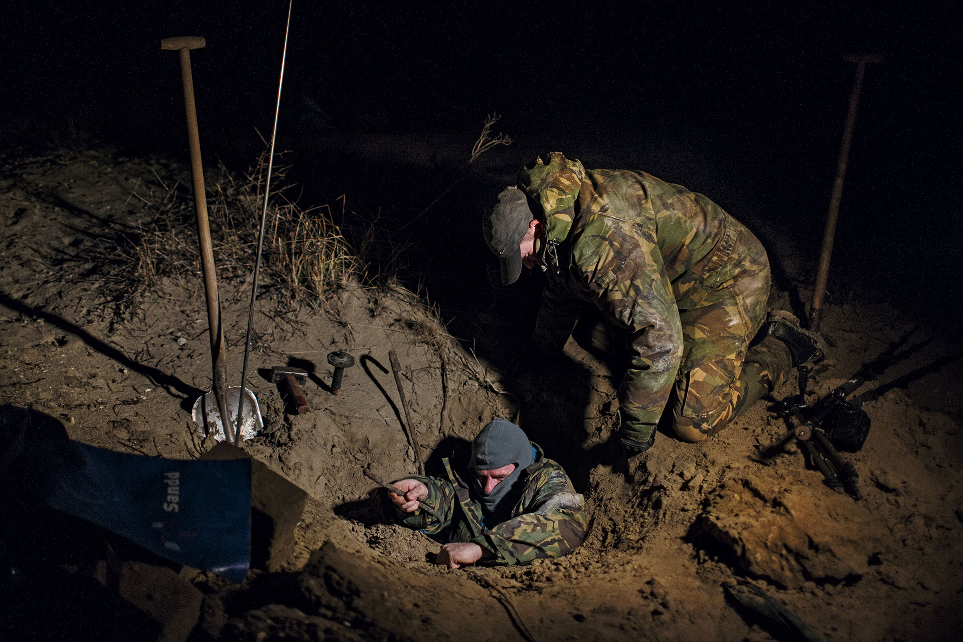 ‘Bunkergravers noemen onbetreden bunkers maagden’, zegt fotograaf Ilvy Njiokiktjien, ‘als zo’n bunker eenmaal door een groep is betreden dan is de lol voor de meesten er wel zo’n beetje af’. Rosanne Kropman, een freelancer waar Njiokiktjien vaak mee samenwerkt, kreeg een tip over mannen die ’s nachts in de duinen op zoek gaan naar Duitse bunkers uit de Tweede Wereldoorlog. Zij heeft het eerste contact gelegd met een bunkergroep uit Zandvoort. Tot haar verbazing zagen die jongens er geen been in om de twee journalisten mee te nemen op een van hun illegale strooptochten. Het verslag met de foto’s uit de Amsterdamse Waterleidingduinen stond 29 april in de Volkskrant.