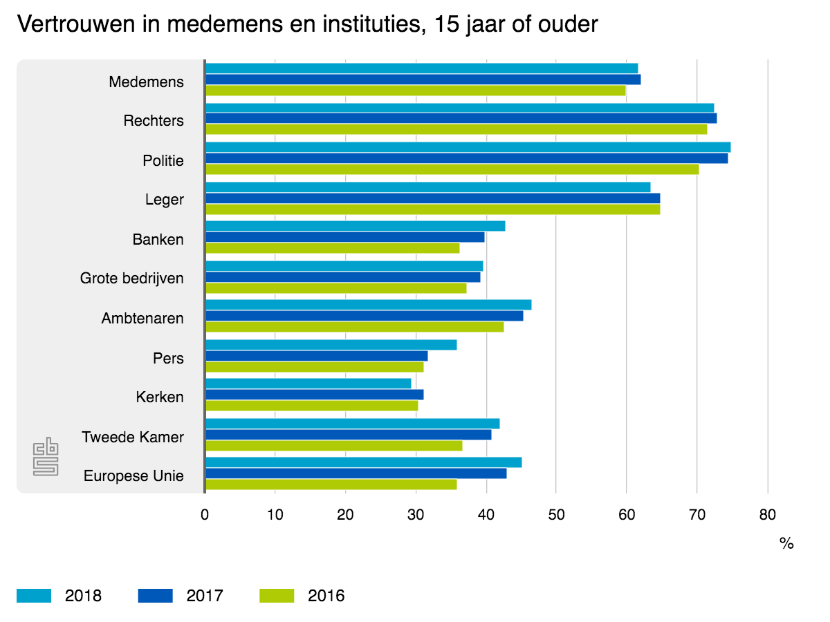 De journalistiek staat overigens niet alleen in relatief laag vertrouwen: ook banken, grote bedrijven, kerken, ambtenaren, de Tweede Kamer en de Europese Unie wordt door minder dan de helft van de Nederlanders vertrouwd.