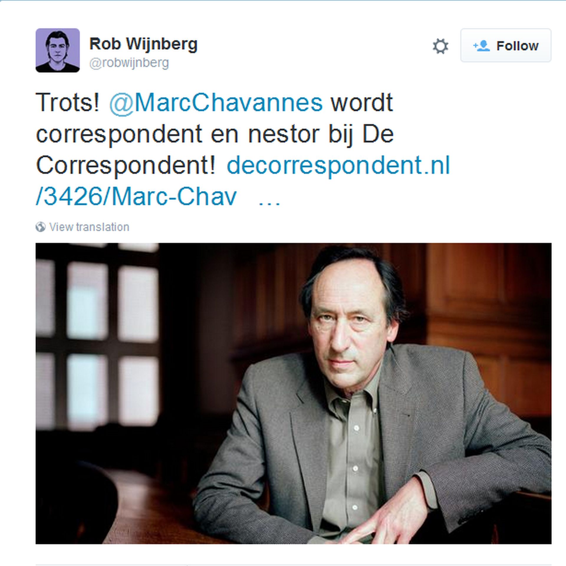 NRC-redacteur Marc Chavannes gaat werken voor De Correspondent, dat meldt hoofdredacteur Rob Wijnberg. Chavannes gaat op de redactie een rol vervullen van "journalistiek geheugen en klankbord". Naast zijn rol als nestor zal hij ook blijven schrijven voor De Correspondent, in ieder geval over de vaderlandse en internationale politiek.