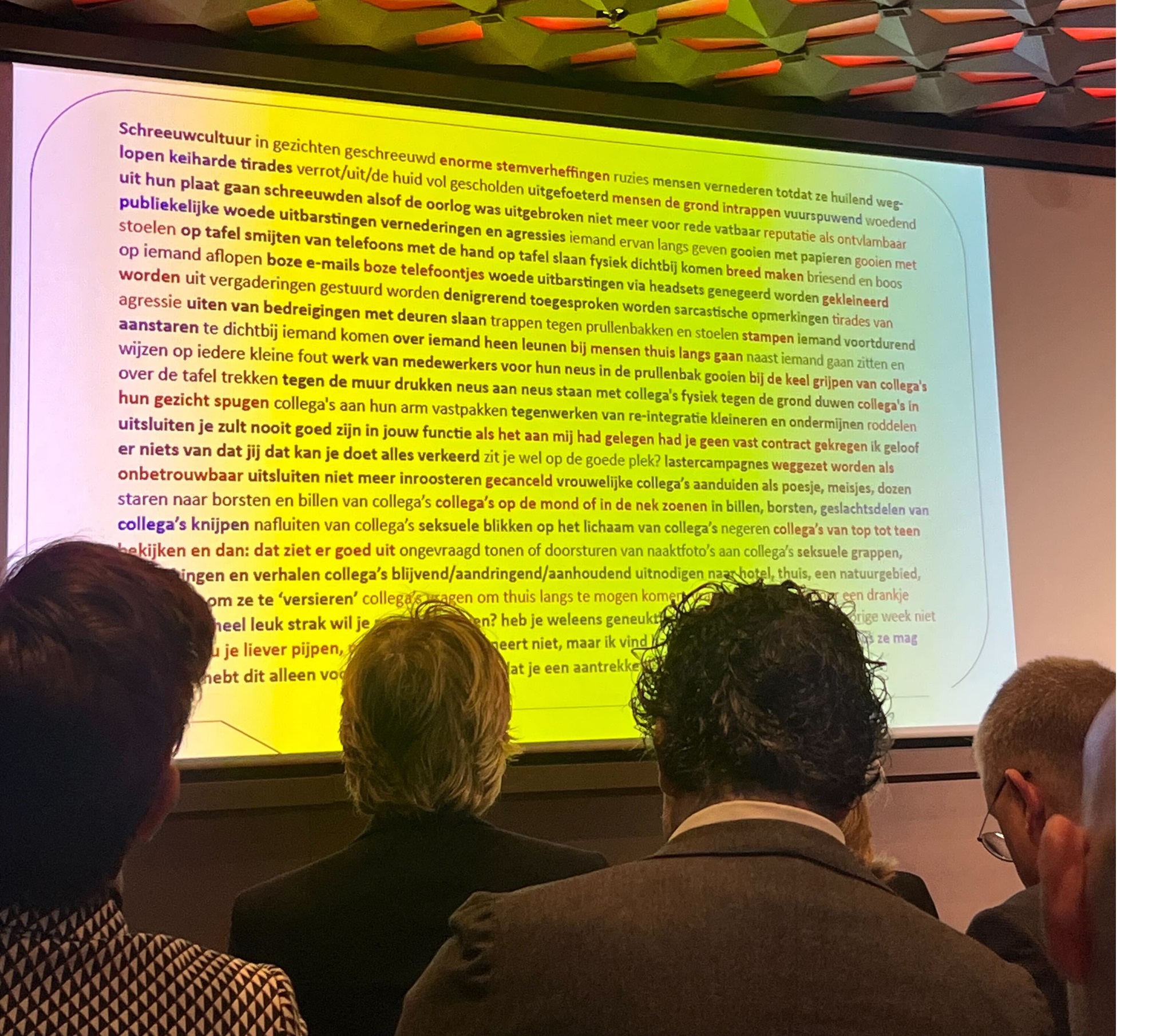 ‘Aangesproken worden creëert niet gelijk een onveilige werkomgeving. Het volharden in grensoverschrijdend gedrag en het niet corrigeren van dit gedrag, doet dat wel’, aldus Van Rijn.