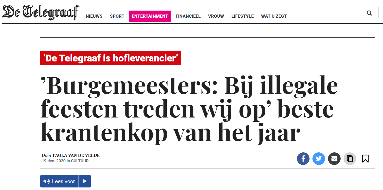 De beste krantenkop van het jaar stond op Nu.nl: Burgemeesters: bij illegale feesten treden wij op. De kop kreeg zaterdag dit predikaat van journalist Rutger de Quay in het NPO Radio 1-programma De Taalstaat.