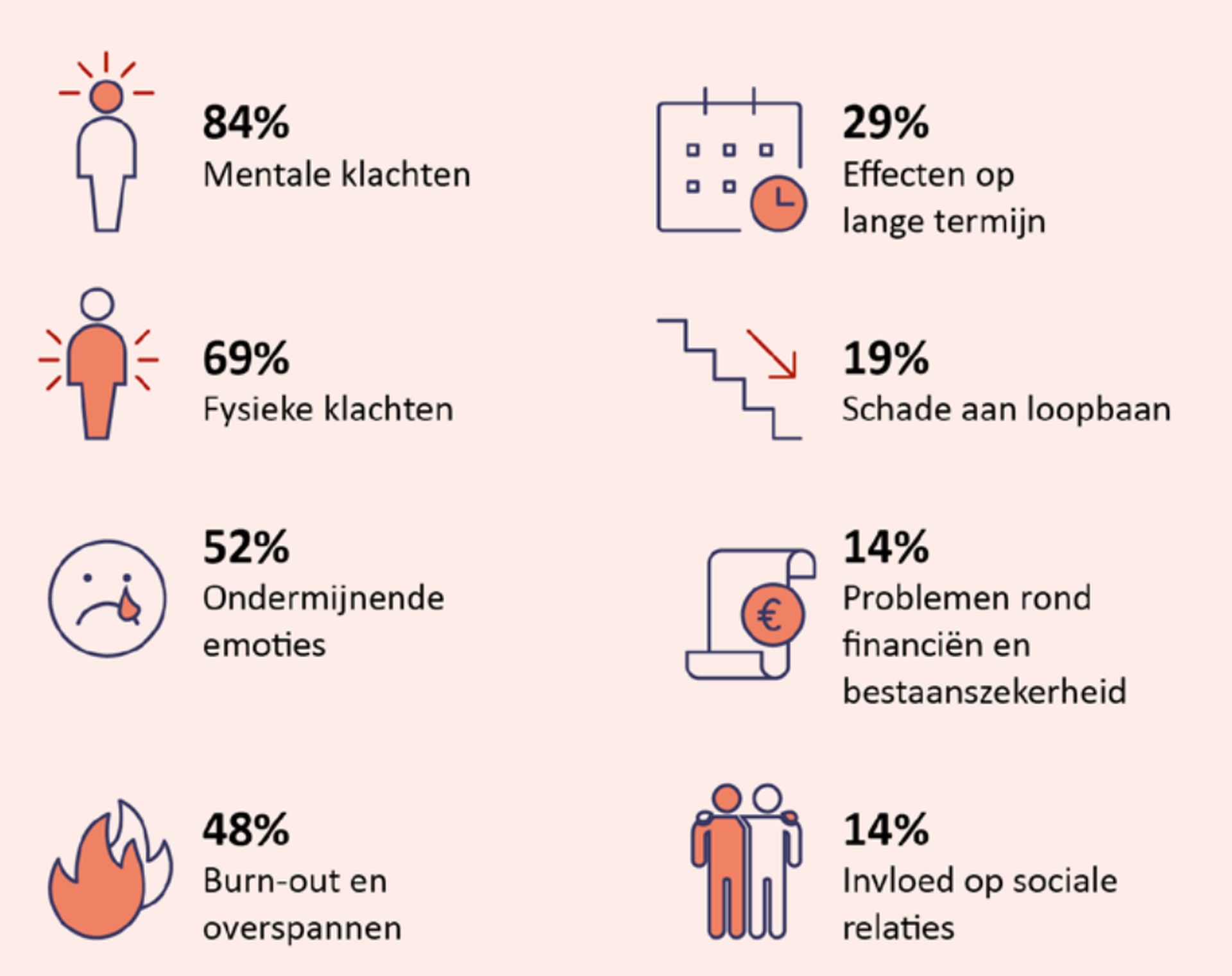 Een deel van de medewerkers benoemt dat zij te maken hebben met (nog) zwaardere mentale klachten, zoals klinische depressies en PTSS-klachten. Er zijn enkele medewerkers die kamp(t)en met suïcidaliteit.