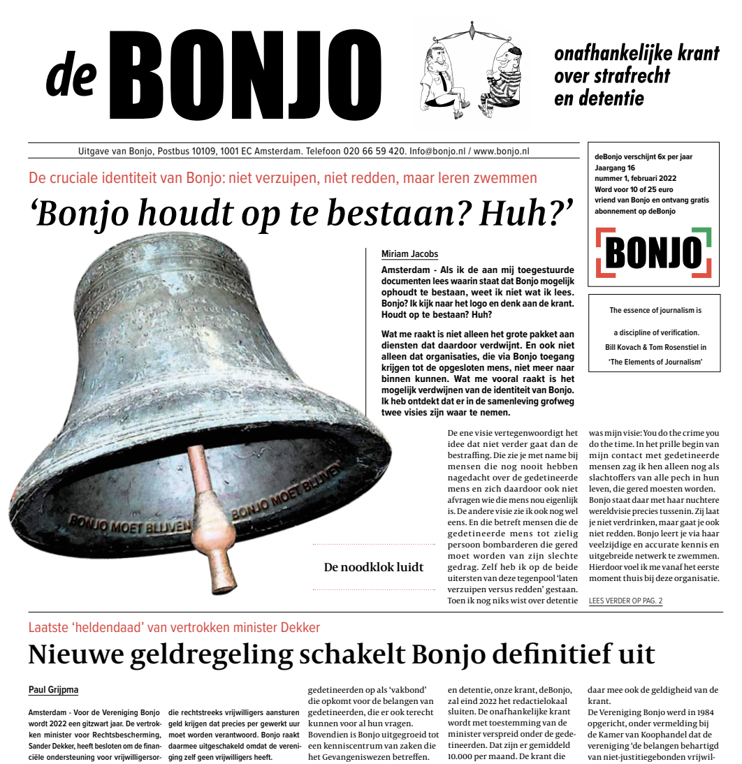 De Bonjo, de enige Nederlandse krant voor en door gedetineerden met een oplage van circa 8000 exemplaren, dreigt te verdwijnen. De krant is al sinds jaar en dag een begrip in het gevangeniswezen en onder (strafrecht)advocaten. Blader ‘m door en je struikelt over de advertenties van advocaten en rubrieken zoals ‘BonjoContactBureau’, of zoals in de woorden van hoofdredacteur Paul Grijpma, ‘boef zoekt vrouw, voor als je een schrijfvriend of vriendin zoekt’.