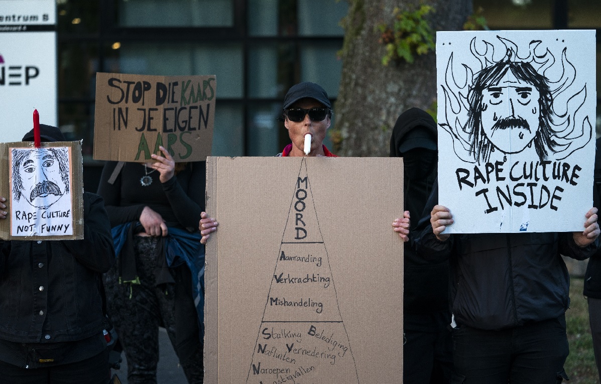 Het ging om een groep van tien tot vijftien personen, die joelend voor het gebouw stond. Mensen droegen borden en spandoeken bij zich met teksten als ‘Rape culture inside’, ‘Geen platform voor rape culture’, ‘Stop die kaars in je eigen aars’ en ‘Geen buhne voor racisme seksisme’.