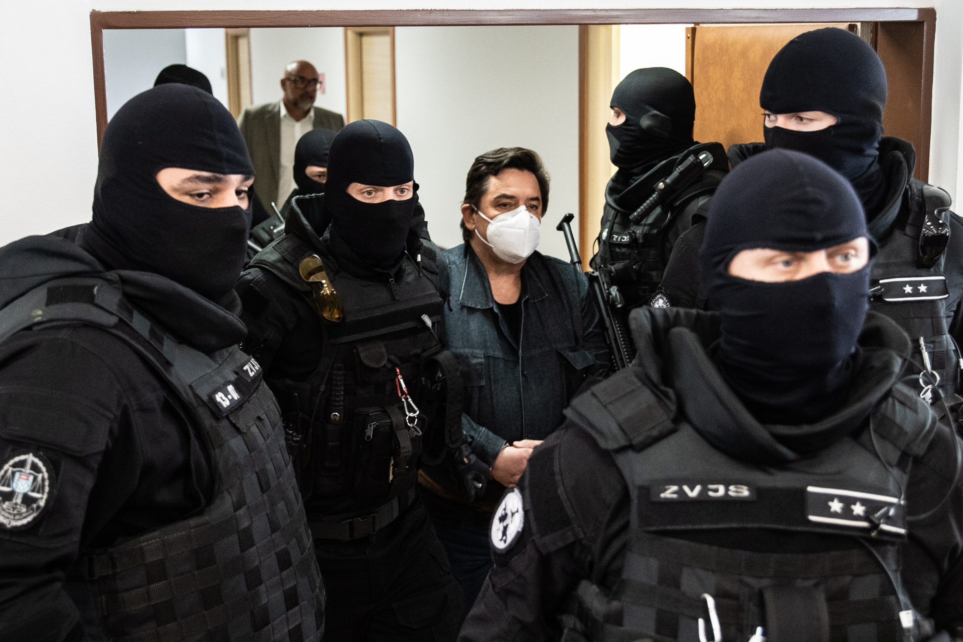 Mei 2023: zakenman Marián Kočner (met masker) arriveert in de rechtszaal om het oordeel te horen over zijn vermeende betrokkenheid bij de moord op journalist Kuciak. Er zou vrijspraak volgen wegens gebrek aan bewijs en procedurefouten. | EPA