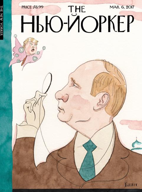 ‘This one has a surprising twist, albeit a subtle one. Each year on its anniversary, The New Yorker puts its mascot, Eustace Tilly – a dandy with top hat and magnifying glass – on the cover. And then do something funny with it. It’s a tradition – The New Yorker has been around for more than a century. This year they had turned their mascot into Putin, with Trump represented as a butterfly under scrutiny. And look at ‘The New Yorker’ in Russian above it. As far as I know, this is the first time the logo has been altered. And yet it’s recognisable, which is bizarre. I only noticed that after looking three times.’ © The New Yorker & Barry Blitt