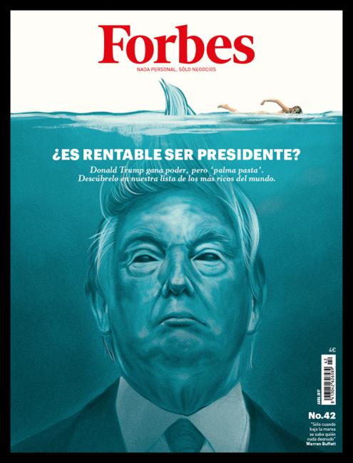 ‘A totally different approach, ten steps too far if you ask me. Imagine the brainstorming session: we are going to depict Trump under water, something with a shark and a wisp of hair. Whatever made them think of that? And yet it has turned out quite captivating.’ © Forbes & Jared Yamahata