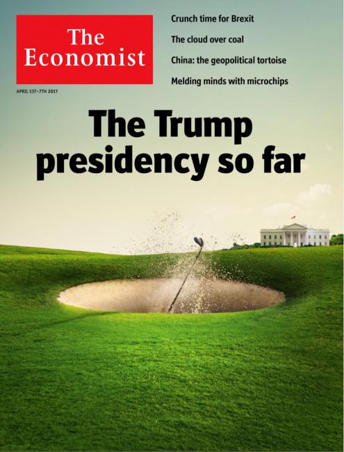 ‘A few months into Trump’s presidency the moment came when people began asking themselves: what’s really going on? Not much actually. He was only playing golf and lashing out at those around him, whilst sinking further into the swamp. You can see this here. A fantastic Trump cover, without actually seeing the man himself.’ © The Economist