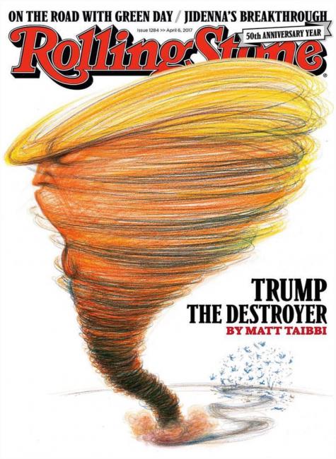 ‘If you look closely, you can see they’re just scratches, and yet you see Trump in it. I have never seen Trump depicted as a tornado. Original.’ © Rolling Stone & Victor Juhasz