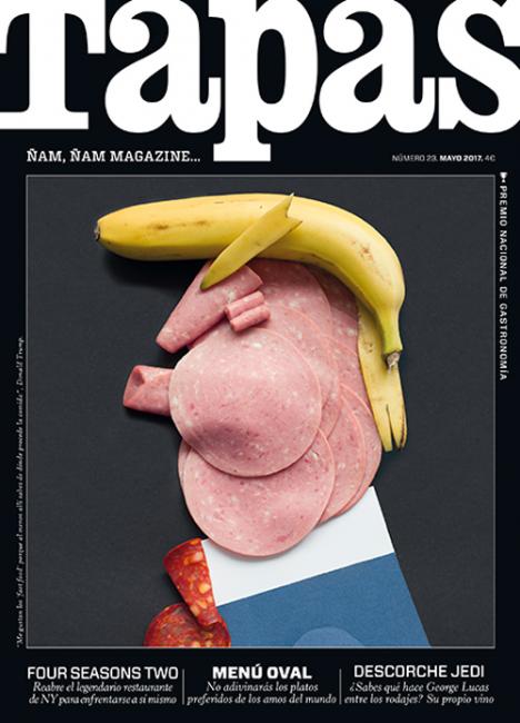 ‘I had seen this image somewhere before it ended up on a cover, and actually put it on my Coverjunkie Instagram. It had the most likes ever. What’s so clever is all those disgusting slices of luncheon meat. It’s amazing that people recognize Trump in this. It became a hype on social media. This Spanish culinary magazine later put it on its cover.’ © Tapas & Asier Sanz Nieto