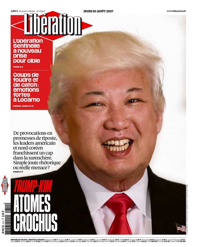 ‘This was published at a time when the face-off between Trump and the North Korean leader Kim Jung Un reached its high point – or low point. The combination of faces is very effectively. You can also do it the other way round; Kim’s hair and Trump’s mouth. I wonder what that would look like.’ © Libération & Guillame Titus-Carmel