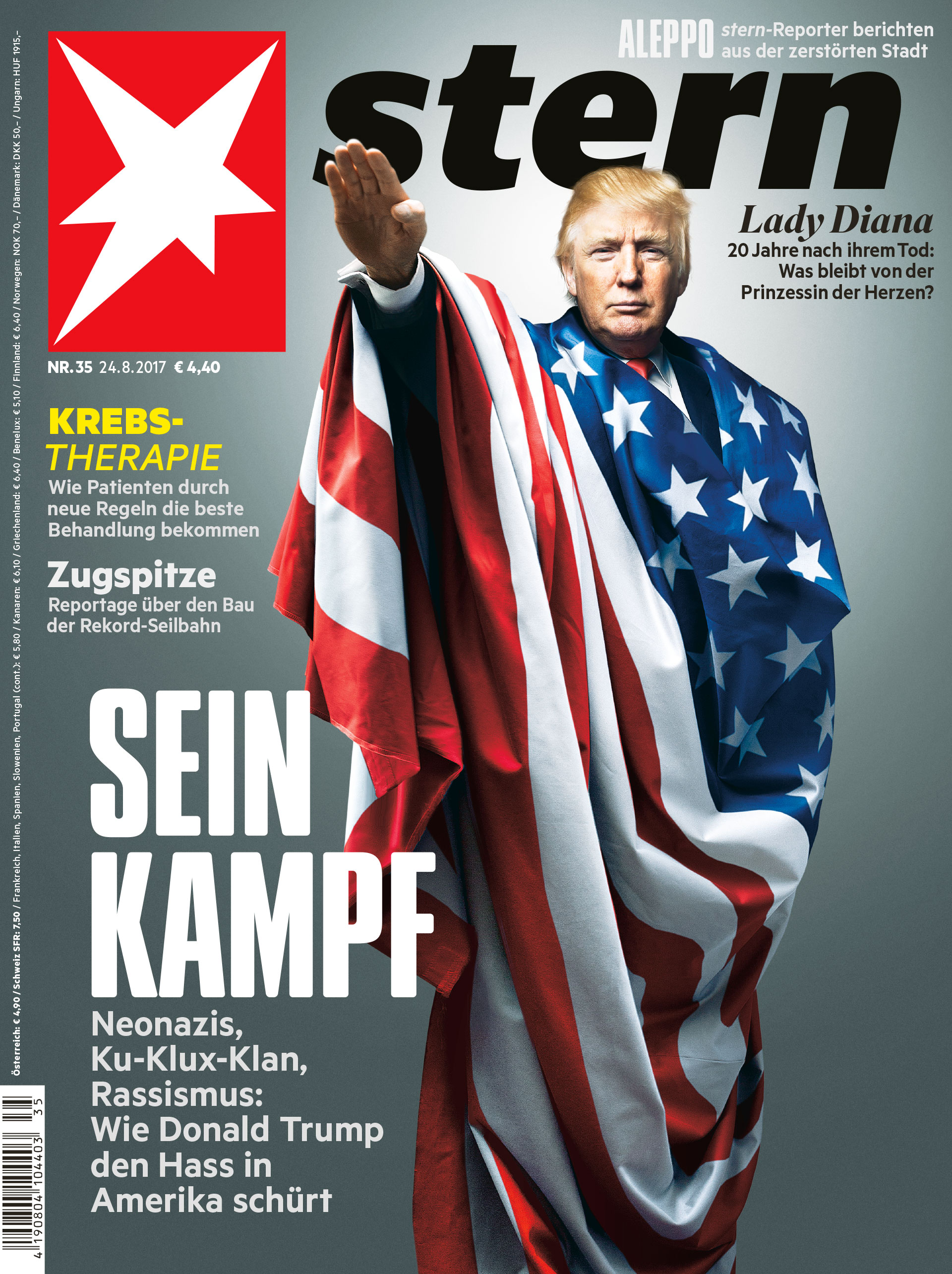 ‘This one is far too explicit for me. And from Germany, even. When I received this I did ask them: aren’t you going to get into trouble for this? But the editorial staff had made a well-considered choice. And it did cause a commotion. I personally find it tasteless to compare someone with a man who killed 18 million people. Regardless of what you may think of him.’ © Stern & Derik Meinko & Michel Lengenfelder