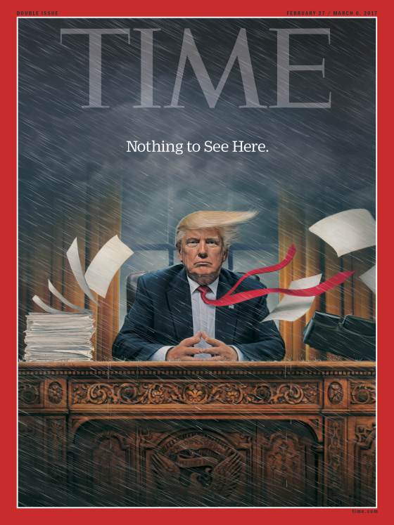 ‘There is a storm raging, and Trump says: nothing to worry about. Beautifully drawn, especially his hair.’ © TIME & Tim O’Brien