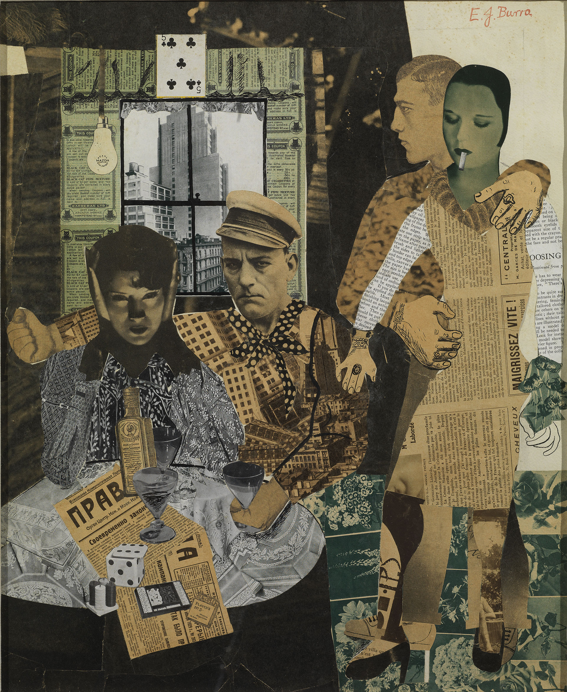 Maar het is niet allemaal kommer en kwel. ‘Composition Collage’ uit 1929 van de Engelse kunstenaar Edward Burra (illustratie 1) borduurt voort op de papier collé-traditie van Picasso maar is wel realistischer en zelfs humoristisch. Wat er in de Russische en Engelse krant staat is onduidelijk maar de Franse krant bericht over Germaine Laborde, Miss France 1928, met daaronder een advertentie (Vermager snel!). De vrouw wordt omarmd door de Italiaanse bokskampioen Primo Carnera en aan het tafeltje zitten Amerikaanse filmsterren.
