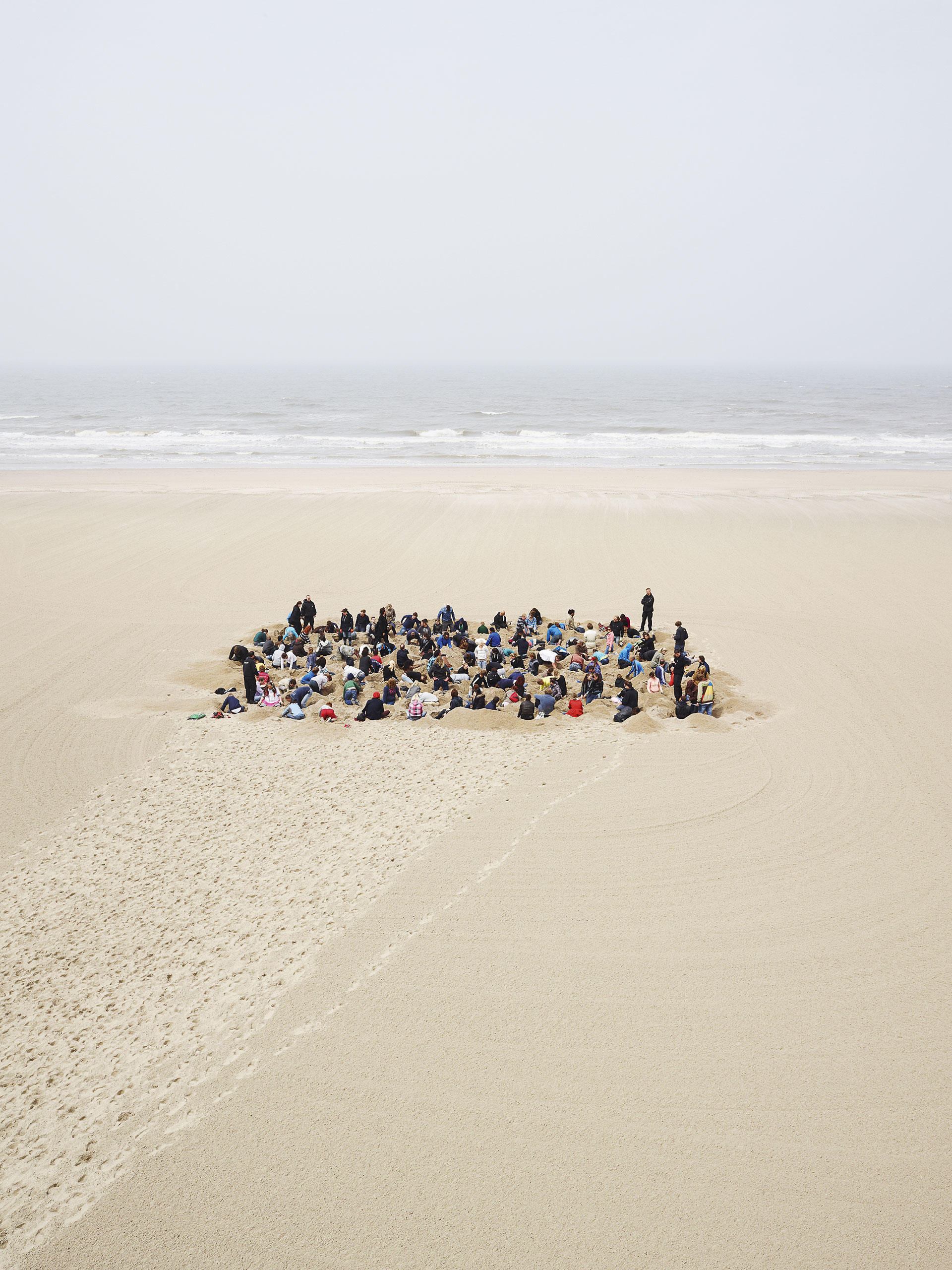 Een enkele keer laat de fotograaf zelf een subgroepje ontstaan. In 2012 las hij over schatgraafwedstrijden in de jaren ’50 en ’60, een vergeten evenement. De fotograaf besloot met toestemming van de gemeente 25000 vierkante meter strand af te palen, machinaal te egaliseren en ergens een schat van duizend euromunten te verstoppen. Vanaf een hoogwerker zou hij de invasie van schatgravers in tien foto’s vastleggen. Met de verkoop van de foto’s kon hij zelf een ‘schat’ verdienen. Na zijn oproep stroomde het strand vol met gelukzoekers. De munten werden met de hand opgedolven. De fotograaf had er beelden van. ‘Ik heb er het dubbele aan verdiend.’