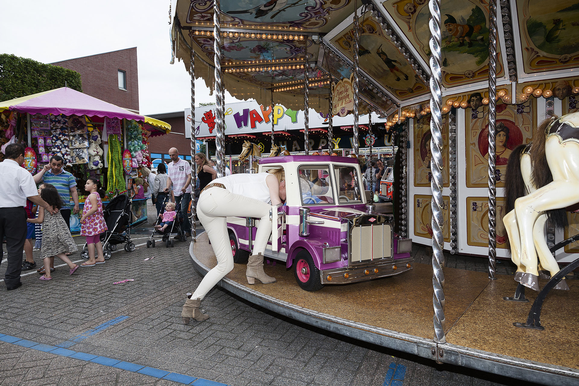 De Krom woont al dertig jaar in zijn ouderlijk huis, een eenvoudige rijtjeswoning uit de wederopbouwperiode. Alleen voor zijn studie aan de Sint Joost kunstacademie in Breda was hij een paar jaar weg. Daarna volgde een keuzemoment: zou hij zich als beginnend fotojournalist vestigen in Rotterdam of Amsterdam, de natuurlijke weg voor veel afgestudeerden, of was hij thuis nog niet klaar? De Krom, nu op zijn rug liggend, praat half tegen het plafond: ‘Tijdens mijn studie ontdekte ik mijn interesse in thema’s als burgerlijkheid, groepsgedrag en kleine gemeenschappen. Door de afstand van huis was ik objectiever geworden. Ik moest van mezelf in Hoek van Holland blijven en mijn eigen gekke dorp bestuderen. Voor het geluk moet ik elders zijn.’