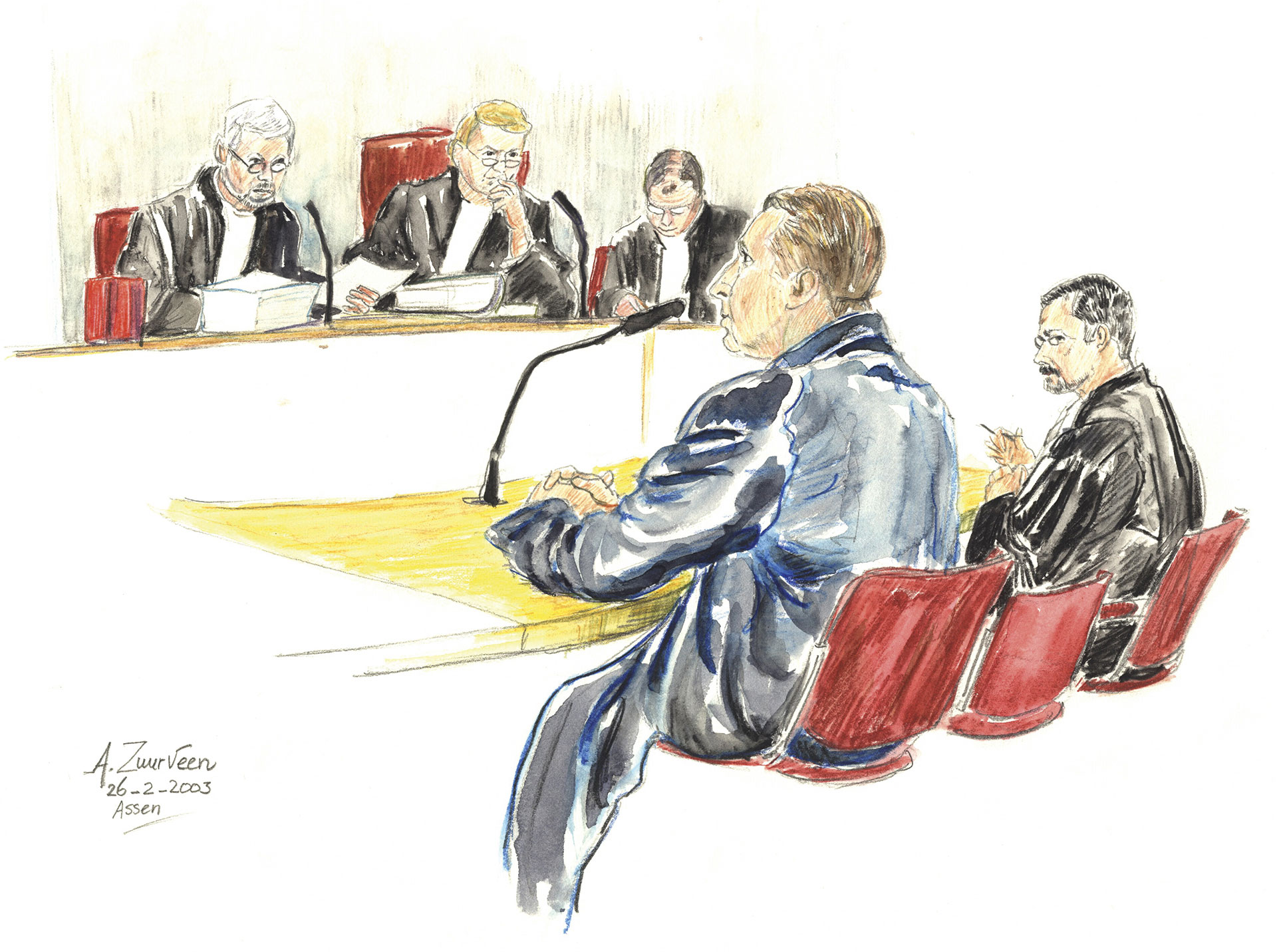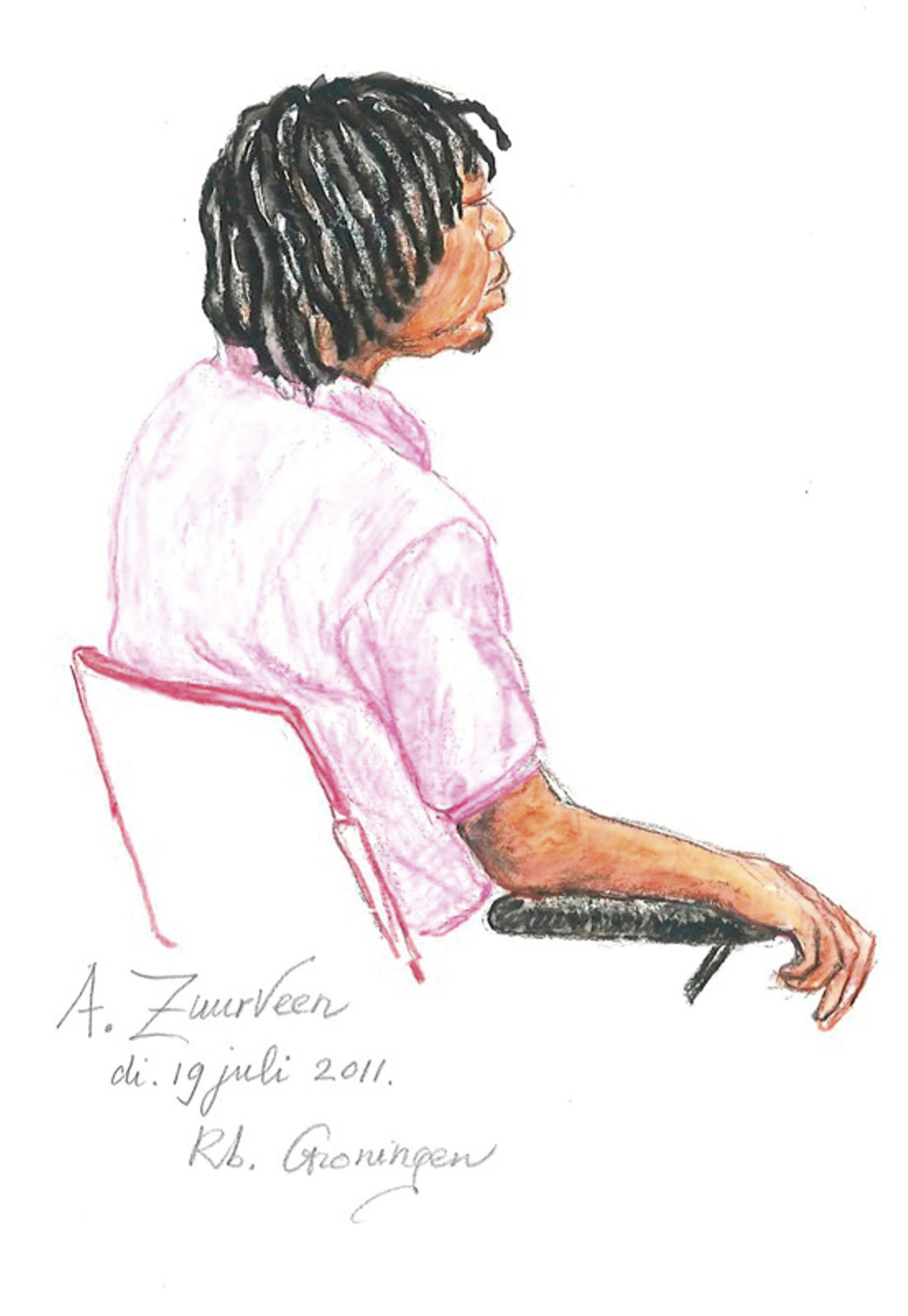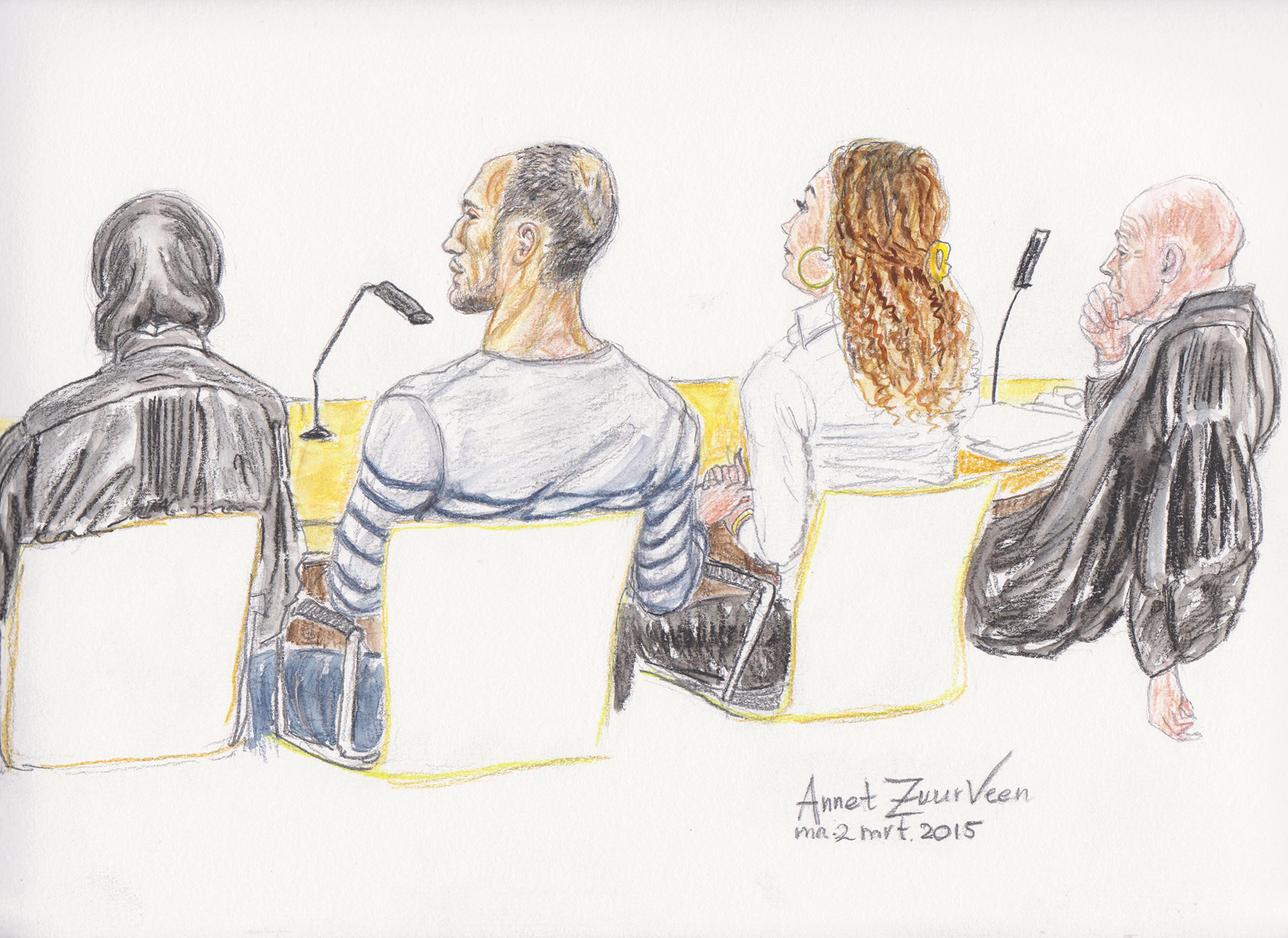 Foto- en filmcamera’s zijn nog altijd niet toegestaan in de rechtszaal. Media zijn aangewezen op tekeningen. De Groningse Annet Zuurveen (48) maakt ze al twintig jaar. Het werk is geen obsessie, wel verslavend. ‘Het is theater, waarvan ik deel mag uitmaken.’