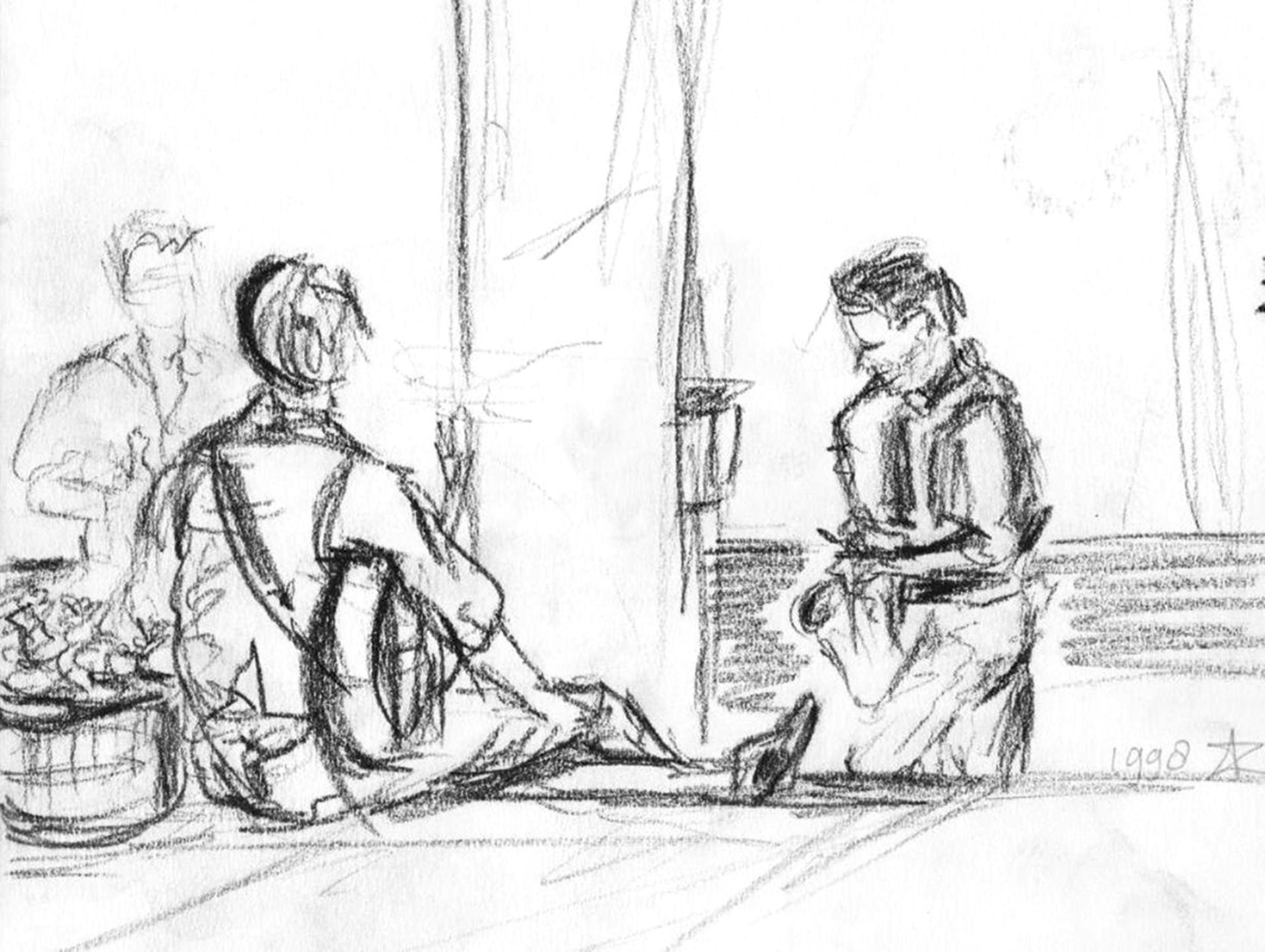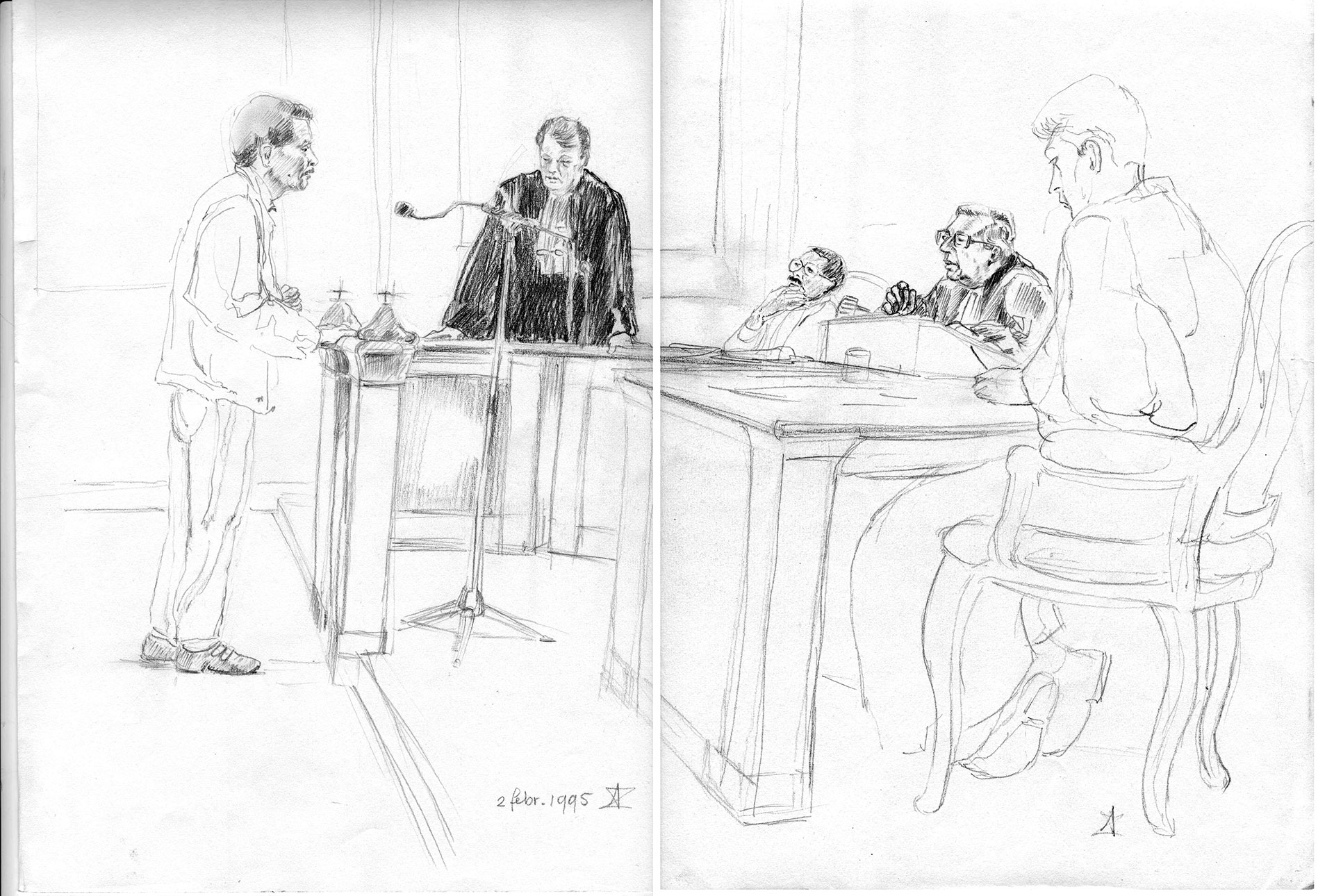 Als meisje wist ze nog niet dat ze voor dit specifieke vak zou kiezen. Ook niet dat ze zou toetreden tot het kleine gilde van rechtbanktekenaars, waarvan er in Nederland vijf actief zijn overgebleven. Wel wist ze dat tekenen haar roeping was. ‘Het zit in de familie.’ Als kind maakte ze op het schoolplein al schetsen van klasgenootjes. Tijdens de opleiding aan de kunstacademie, eerst in Leeuwarden, daarna in Groningen, observeerde ze bewoners van bejaardentehuizen en gasten in cafés. Ze verkocht de bierviltjes met pentekeningen. Op mooie dagen nam ze plaats op een hoge trap tussen de Grote Markt en Vismarkt. Met een vel papier op haar knieën bracht ze in beeld wat ze onder zich waarnam. ‘Het waren altijd situaties met mensen. Ik was geobsedeerd door hun onderlinge verhoudingen, zoals later in de rechtbank. Ik maakte er geen deel vanuit, maar was er wel bij betrokken.’