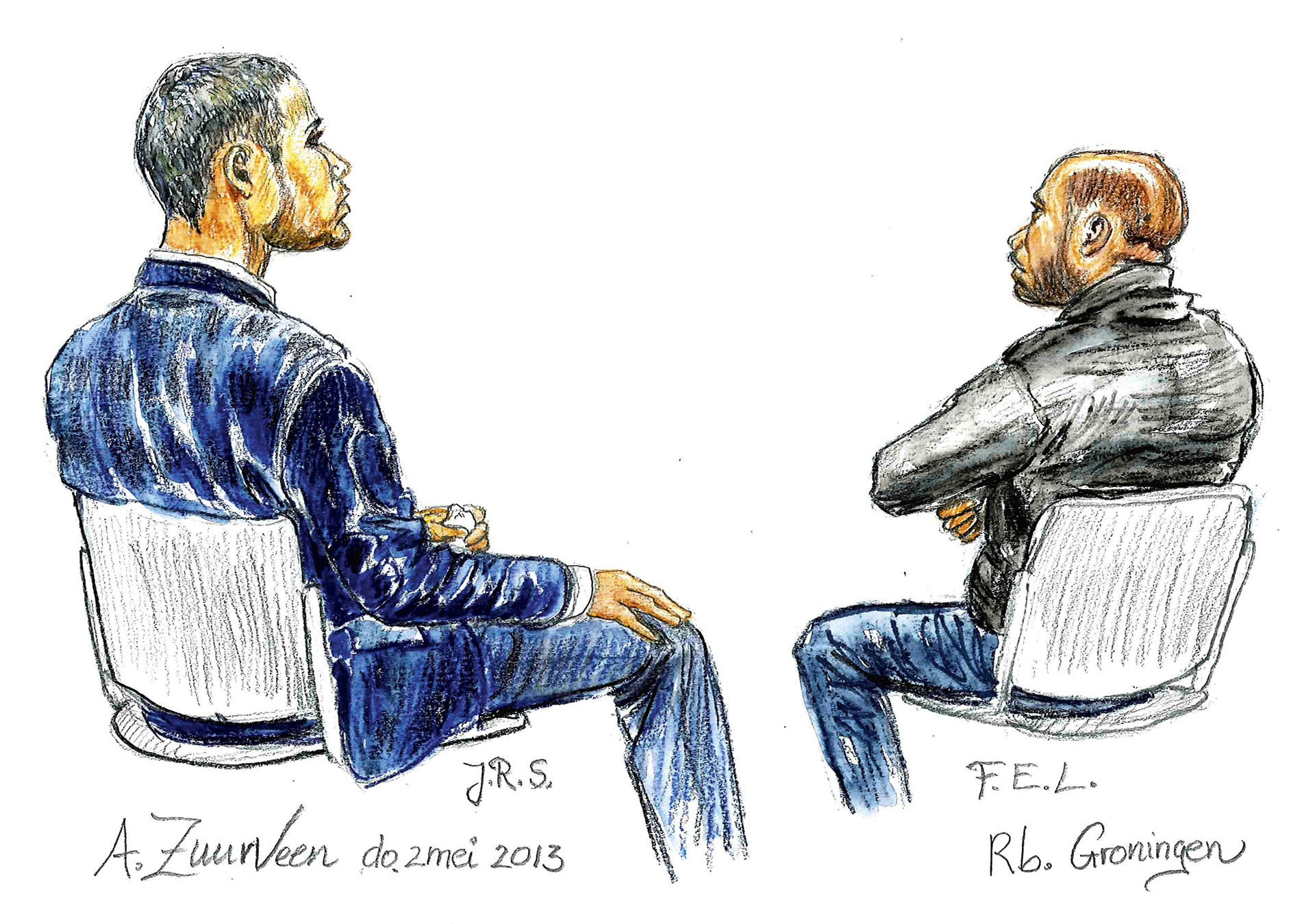 Het huis waar ze nu met haar katten woont, kreeg ze vijftien jaar geleden toegewezen, na het incident met haar buurman, de drugsdealer. Ze kwam hem daarna nog drie keer in de rechtszaal tegen, waar hij terechtstond voor onder meer een gewapende overval. Even was er oogcontact, maar Zuurveen liet zich er niet meer door van de wijs brengen. Ze tekende hem zo neutraal mogelijk, al ‘gebruikte ik misschien wel een scherper potloodje’, zegt ze lachend. ‘De details worden belangrijk. Ik zette zijn snorretje en moedervlek op zijn wang extra aan.’