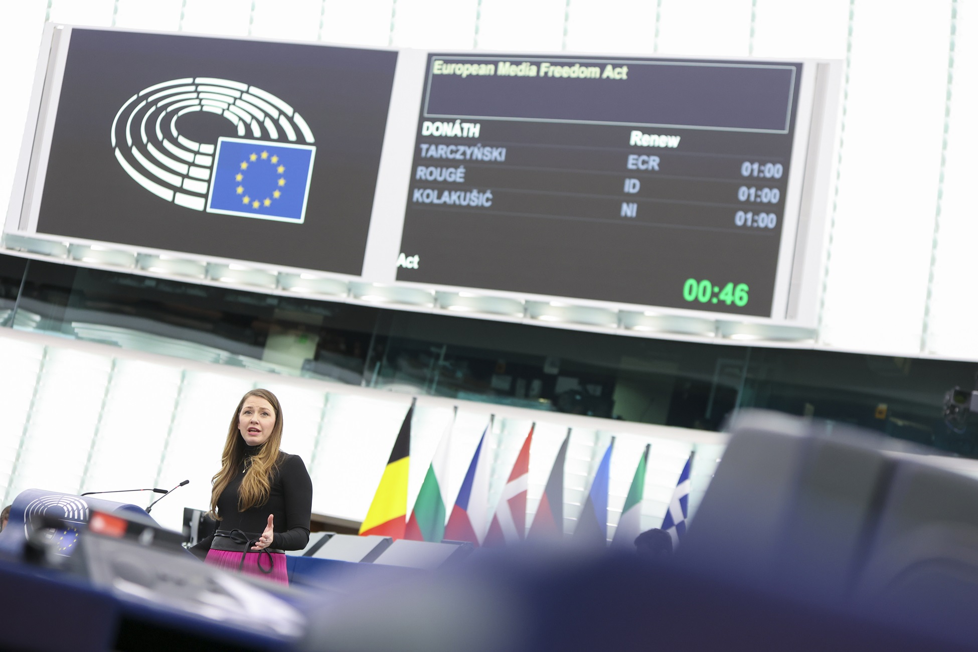 Hongaars Europees parlementslid Anna Júlia Donáth, eerder vandaag tijdens de stemming over de EMFA. | Frédéric Marvaux / European Union
