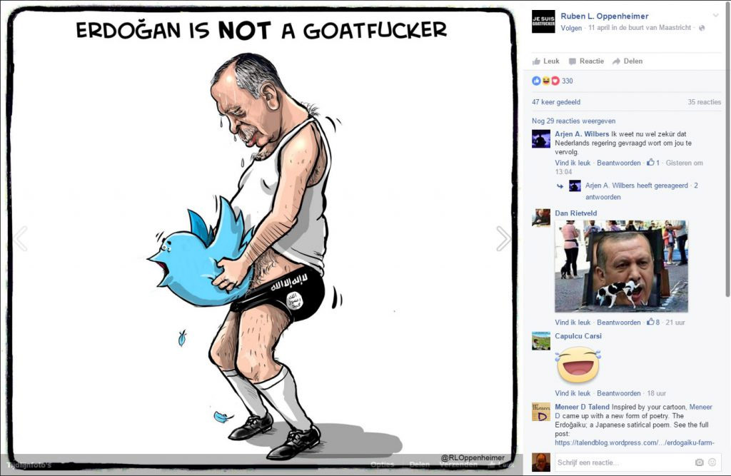 “Een ezel stoot zich geen twee keer aan dezelfde steen, de geiten bij Facebook hebben daar blijkbaar geen enkele moeite mee”, schrijft Oppenheimer op Facebook. Hij plaatst er een Erdogan-fotootje bij van de satirische site TIJM. Die foto kan voorlopig blijkbaar wel door de beugel.