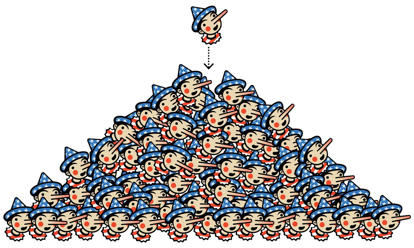 De Washington Post heeft al jaren een factchecking-rubriek, waarin Pulitzer-prijswinnende journalist Glenn Kessler politieke uitspraken langs de lat van de waarheid legt. Leugens krijgen één tot vier Pinocchios, afhankelijk van de leugens. President Trump vereist een nieuwe buitencategorie: de bodemloze Pinocchio.