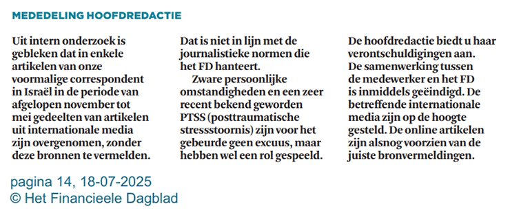 FD beëindigt samenwerking met Israël-correspondent na verzuim bronvermelding