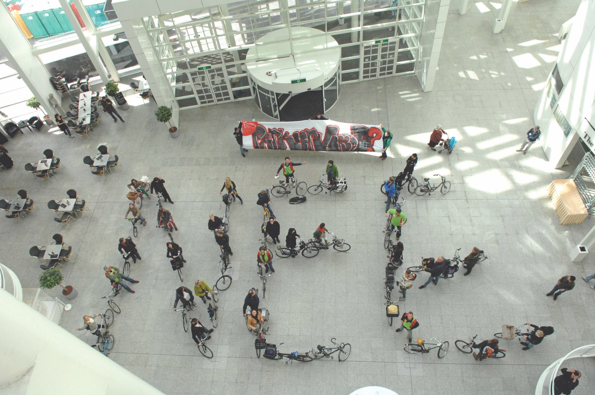 Op vrijdag avond 26 april hoort hij van de politiever slaggeefster van de HC dat er via de sociale media een oproep is uitgegaan om zaterdag ochtend op het Spui te demonstreren tegen het fietsparkeer verbod op de Grote Markt in de hofstad. Een kleine vijftig fietsers zijn komen opdagen bij het stadhuis. Een zekere Jeffrey neemt de leiding. Hij ontdekt dat de draaideur aan de zijkant van het stad huis groot genoeg is voor een fiets. Een voor een glippen de actievoerders binnen.