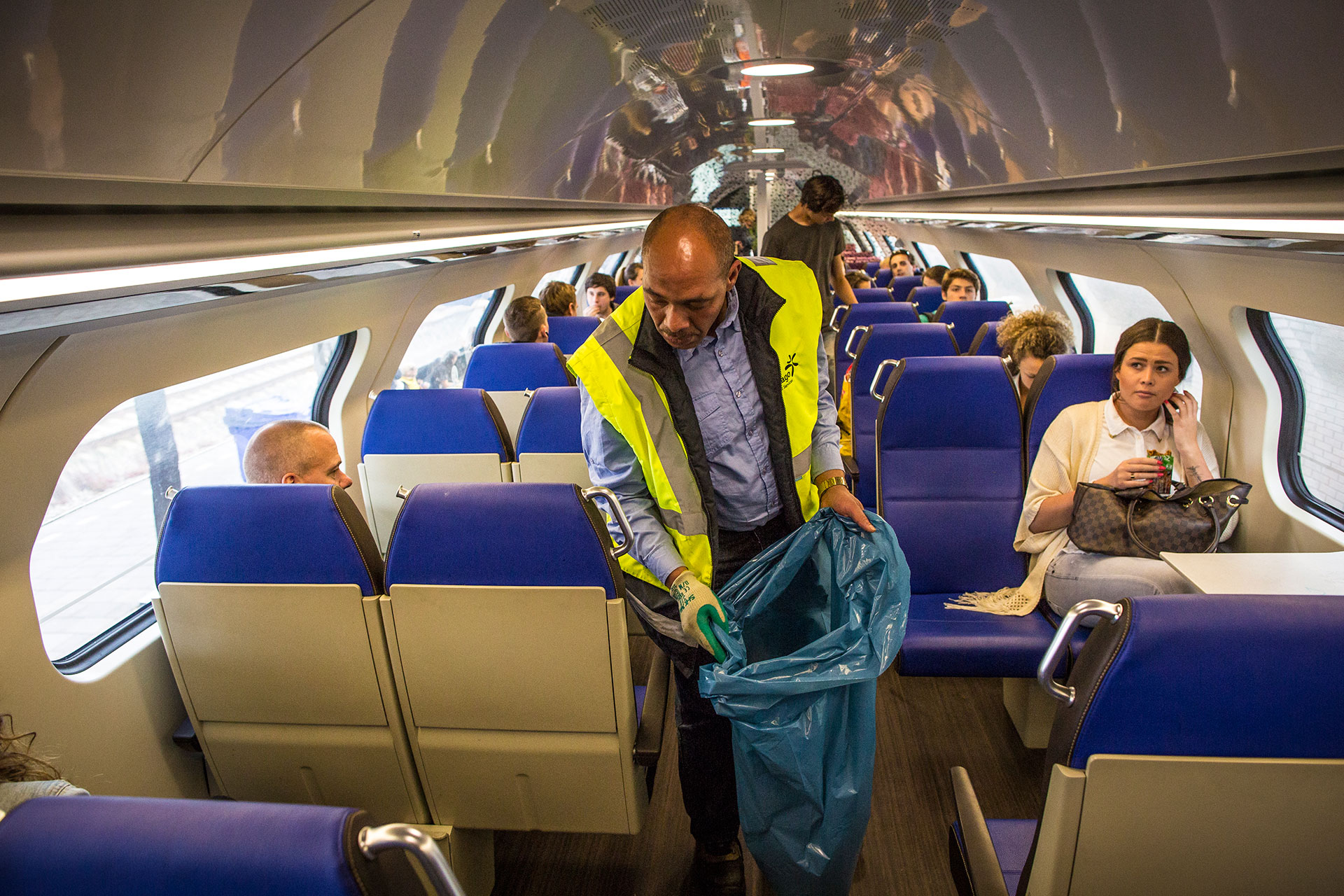 Eén persoon duikt weg zodra hij de fotograaf in de smiezen krijgt. Verder reageert niemand als Marc Driessen achterwaarts lopend door het gangpad van de trein foto’s maakt van een schoonmaker die na een staking van ongeveer een maand weer doet wat hij geacht wordt te doen: rotzooi van reizigers opruimen. Driessen is hier in opdracht van fotobureau Hollandse Hoogte dat sinds januari de nieuwsfotografie voor De Persdienst van de Wegener-kranten voor zijn rekening neemt.