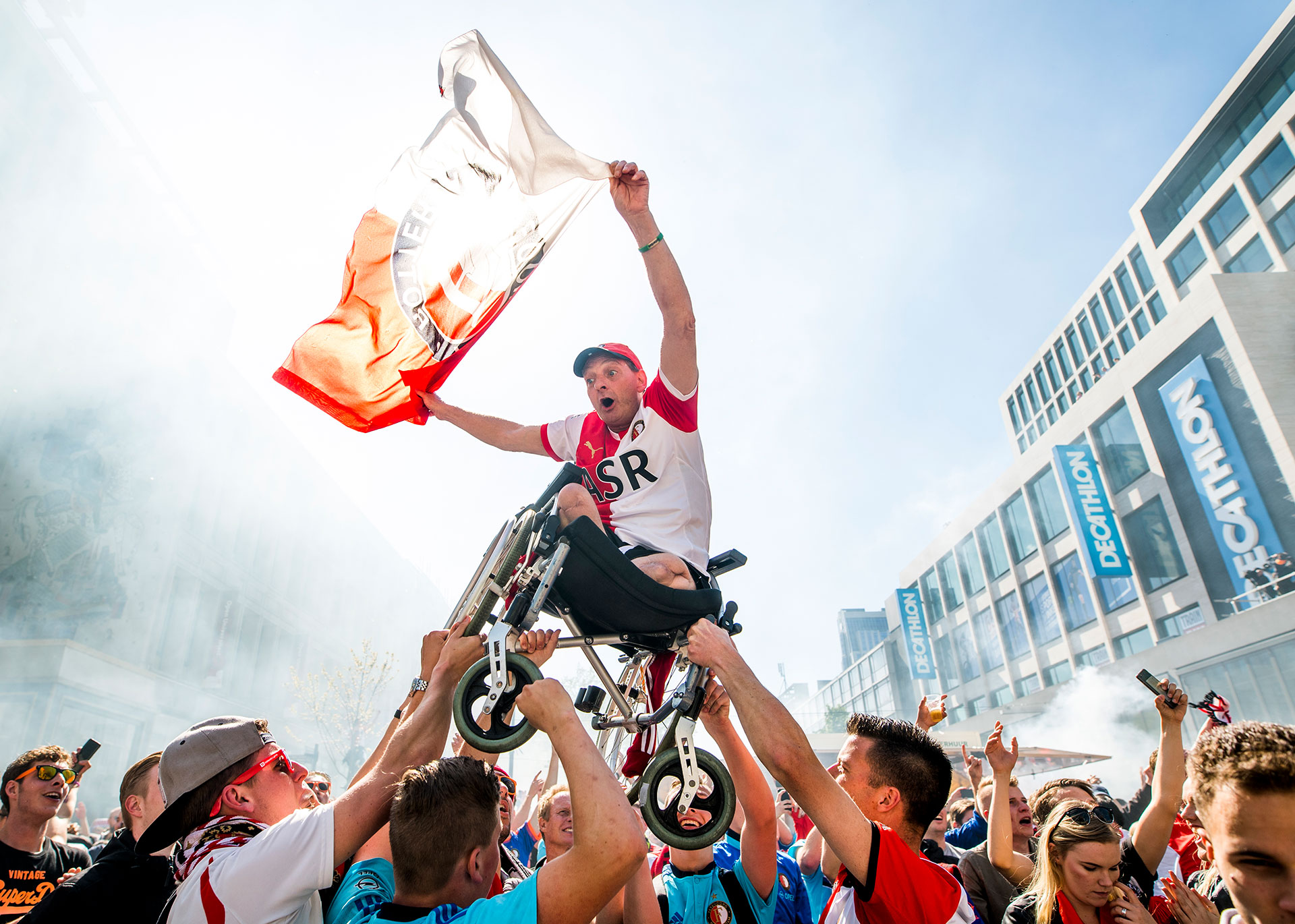 ‘Anders dan de week daarvoor was de sfeer uitgelaten. Al bij de eerste goal tegen Heracles ontplofte de massa. Overal om me heen zag ik bijna Bijbelse taferelen. Recht onder mijn neus ging het dak eraf. Direct na het eerste doelpunt heb ik mijn eerste beelden naar het ANP gestuurd. Na het tweede doelpunt, en ik opnieuw beelden had verstuurd van de uitbarsting van vreugde die over het plein kolkte, vertelde de verslaggeefster van ANP dat ze had gezien hoe even verderop op het plein een man in een rolstoel omhoog werd gehesen. Dat leek mij wel een tof beeld. Ik ging erop af. Het was een kwestie van wachten. Tot mijn verbazing gebeurde er niets toen de penalty erin ging en Feyenoord zijn derde goal maakte. De feestende fans gingen wel uit hun dak, maar de rolstoel bleef aan de grond. Tja, pech, niets aan te doen. En toen kwam het laatste fluitsignaal. Hup daar ging hij, de hoogte in. Met vlag en al. Pats, pats pats, en het stond erop. Die zon erachter maakte het helemaal af. Voor ik naar het Hofplein liep, waar uitgelaten supporters in de fontein doken, heb ik snel drie foto’s van de rolstoelman bewerkt en doorgestuurd. Ik weet niet hoe vaak hij geplaatst is, maar hij stond in ieder geval in Nieuwe Revu, AD, NRC en alle regionale bladen van de Persgroep.’