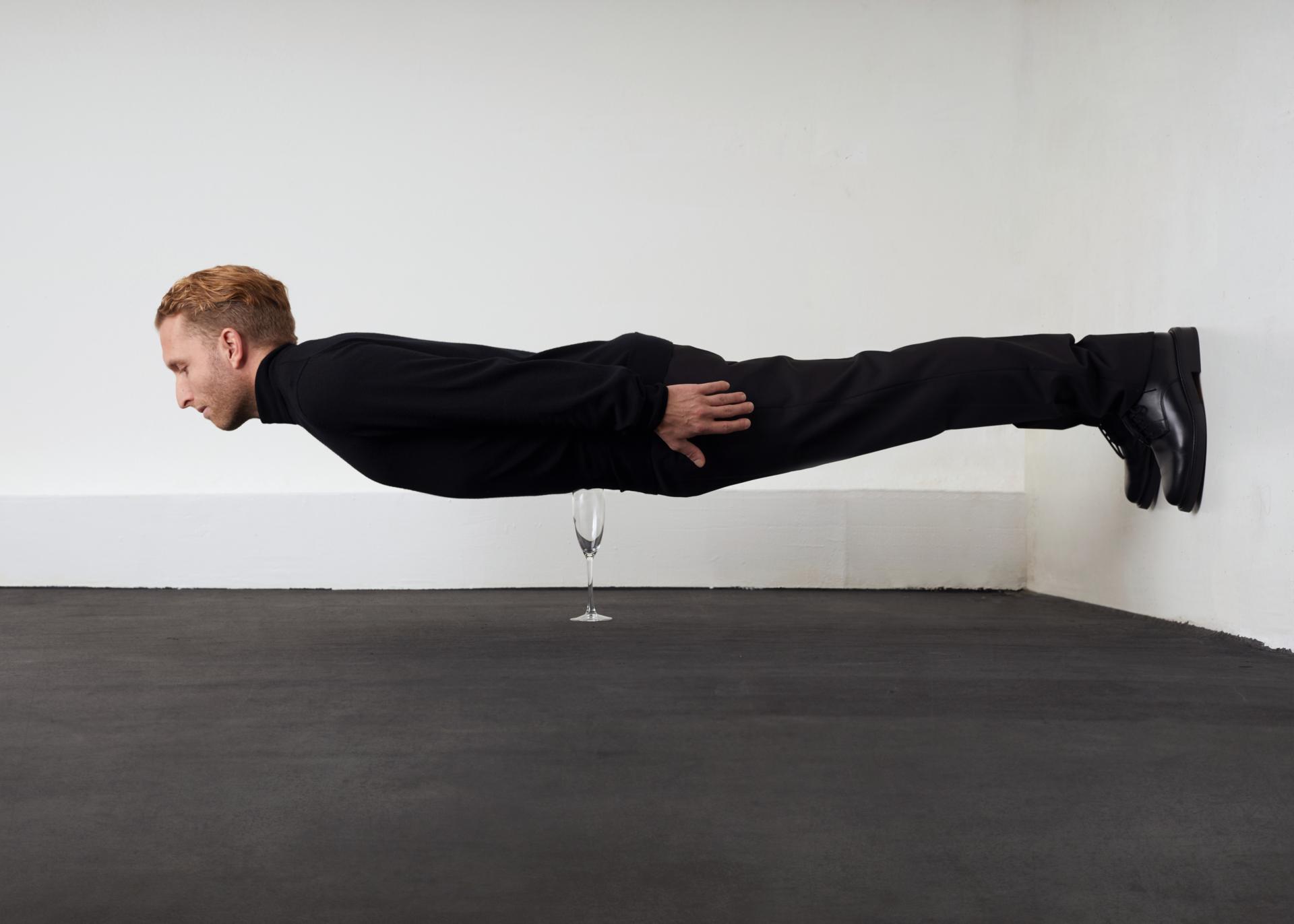 Bij de foto die ik maakte van Michiel Romeyn besloot ik iets met lange armen en benen te doen. Daarvoor heb ik een enorme lap zwarte stof naar de kleermaker gebracht om een soort mouw van te maken. Aan de zijkanten stonden twee assistenten die hun handen erdoorheen staken waardoor het leek alsof dat de handen van Michiel waren. Een grappig effect.’