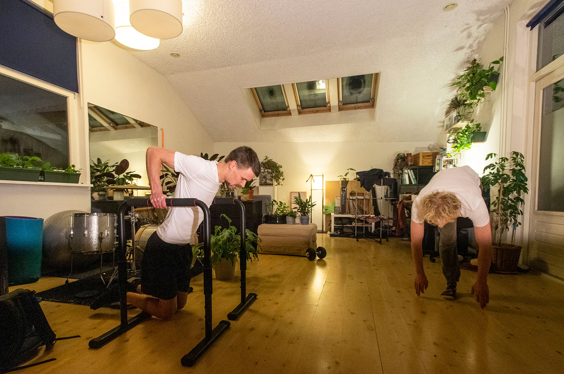 ‘Ruim een half uur later dan afgesproken, bel ik ’s avonds aan bij “het Paarse Huis”. In deze voormalige kantoorvilla wonen dertien jonge mensen. Een stuk of wat creatievelingen uit de muzieksector en een aantal studenten. Verslaggever Bran Remie, die de reportage maakt, is een van de bewoners. Hij doet de deur open. De fotoredactie vroeg me foto’s te maken bij zijn stuk over zijn huisgenoten die door de pandemie tot elkaar veroordeeld zijn. Activiteiten zoals deze wekelijkse fitnesssessie, zijn bedoeld om het met elkaar leefbaar te houden binnenshuis. En om de buikomvang te beperken.