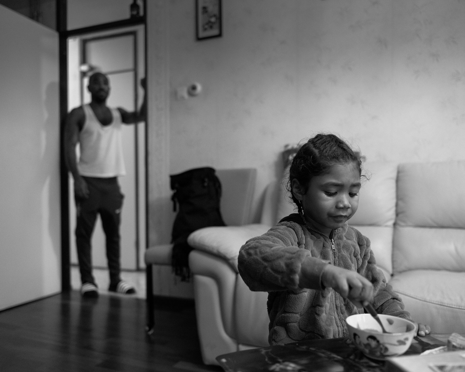 ‘Natuurlijk is die prijs een fucking mooie bekroning van mijn foto’s, voor mijzelf en alle vaders.’ Vanuit de keuken klinkt het geluid van een koffiezetapparaat. Ik sta nog in de gang, mijn natte schoenen zet ik onder een rek vol sneakers. Bovenop staat het haastig geplaatste certificaat van de Paul Peters Fotoprijs, onderdeel van de Zilveren Camera. Dan schuifelt Marwan Magroun (35) behoedzaam uit de keuken. Met de ogen gericht op de koffiekopjes, zegt hij in het voorbijgaan: ‘Maar op dit moment kan die hele prijs me gestolen worden’.