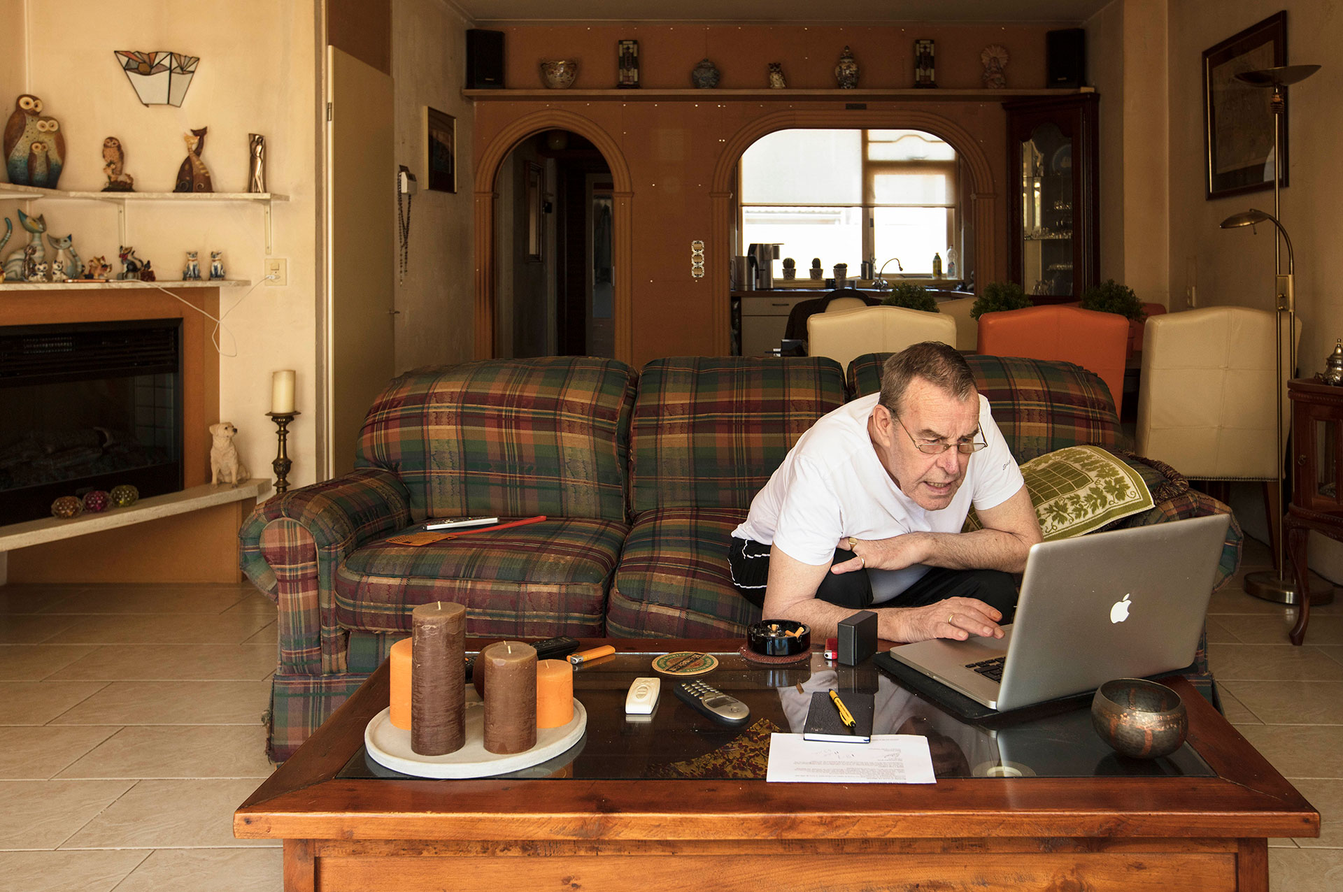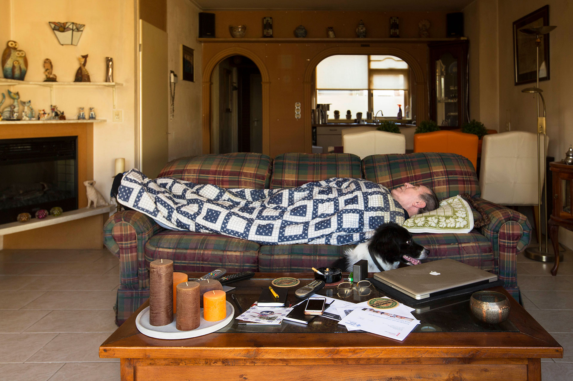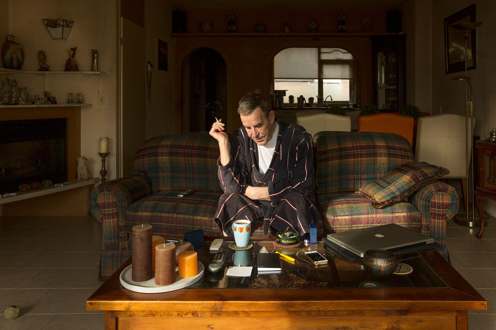 Ze ziet haar vader onregelmatig. Bij elk bezoek zet ze, met zijn toestemming, een statief met camera in de vensterbank. Vanuit die vaste positie maakt ze foto’s van haar vader op de bank. De fotografie werd een onderzoeksmiddel naar haar eigen geschiedenis, ontdekte ze gaandeweg. Vader vertelt mondjesmaat over de ‘grauwigheid’ die zijn eigen jeugd vulde. Veel meer woorden maakt hij er niet aan vuil. Alles heeft te maken met ondergane mishandelingen en zaken waarvoor de politie langs moest komen. Maar hij bleef niet in de misère hangen: ‘Op een dag heeft mijn vader tegen zichzelf gezegd: “met mijn kinderen ga ik het anders doen”. Het was een existentiële beslissing. Mijn twee broers en ik zijn tamelijk normaal opgevoed. Dat had wel een offer: we hadden geen enkel contact meer met mijn vaders familie.’