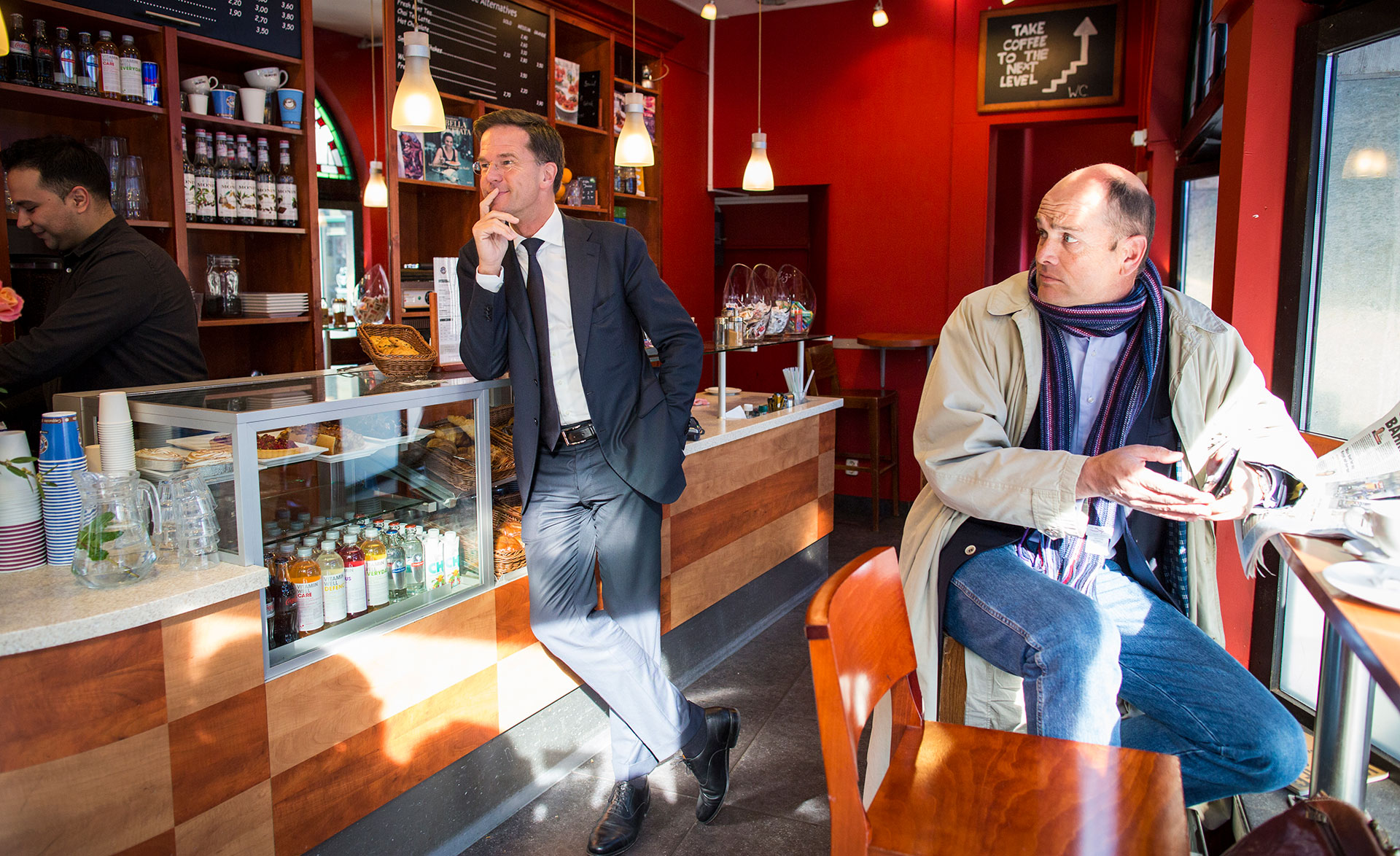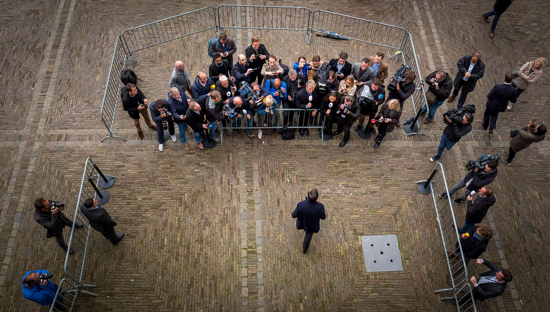 Fotograferen voor kranten blijft zijn hoofdbestaan, zegt hij beneden bij de bar na het interview. Met één hand trekt hij zijn regenjas aan, met de andere veegt hij over zijn telefoon. Het jagen is begonnen. De werkdag begint precies op de plek waar de premier zijn cappuccino pleegt te drinken.