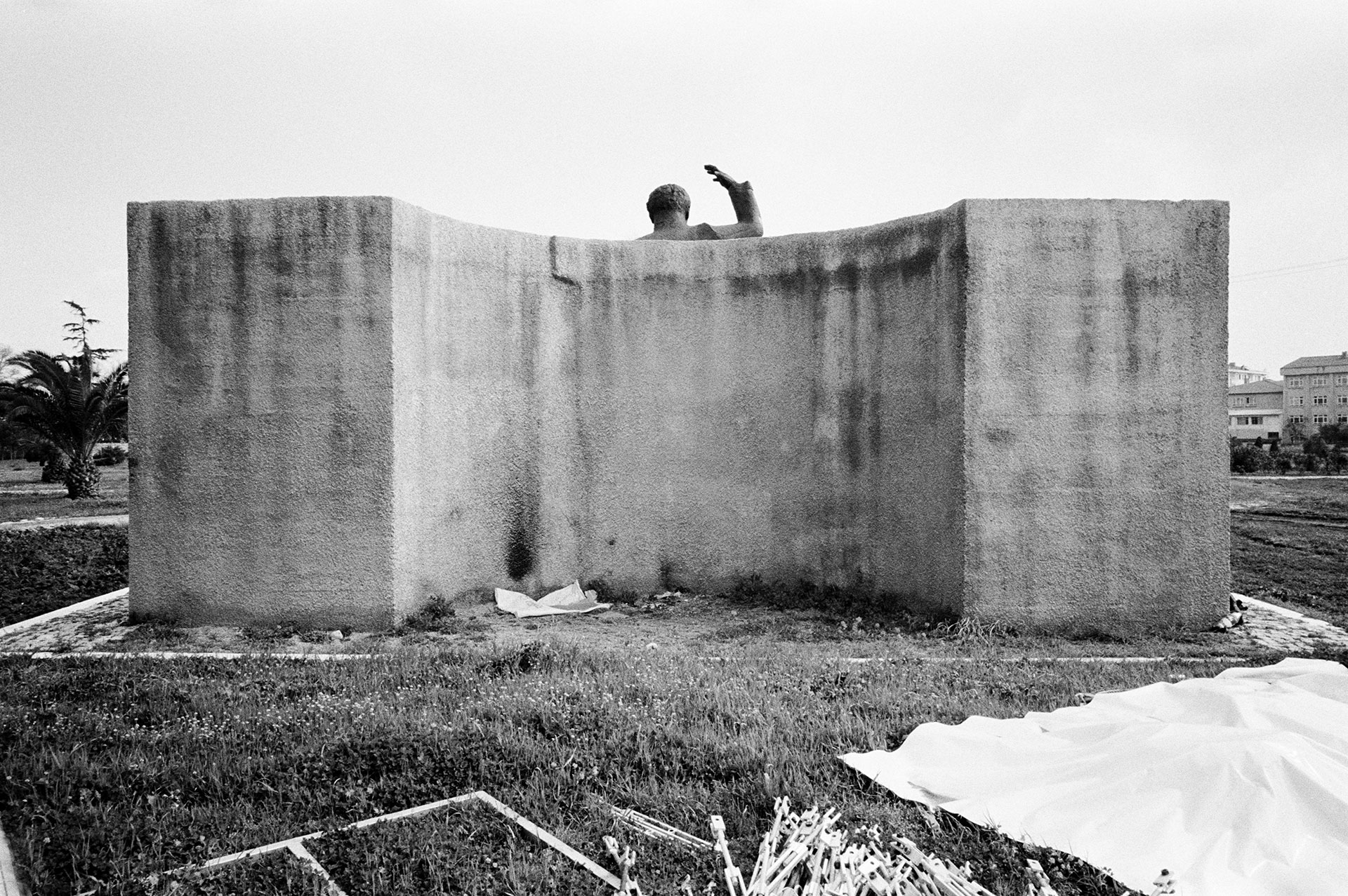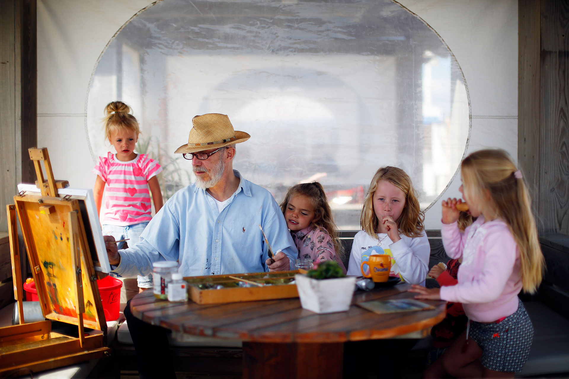 De eerste slierten regen trekken over het terras, schildersezels worden opgepakt. Krijsende meeuwen houden zich boven het strand staande in de wind. Polat pakt zijn camera van de stoel en loopt op zijn gemak naar een groepje mensen om een praatje te maken.