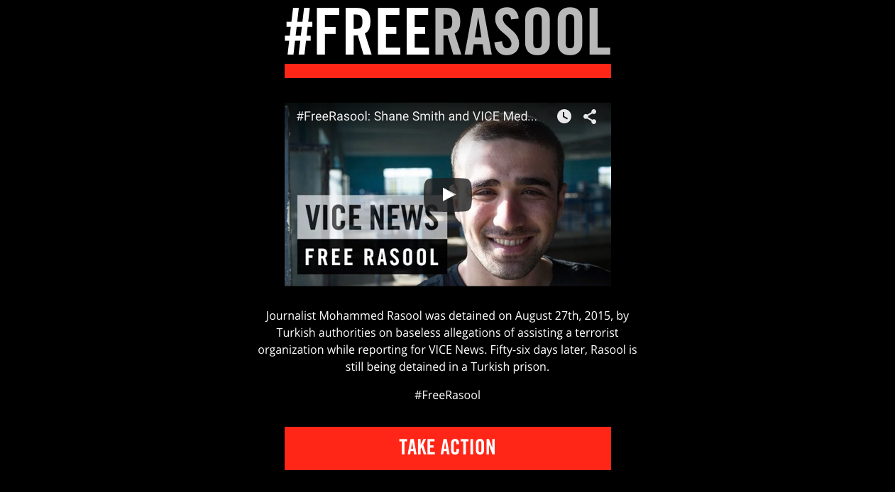 Alle digitale en sociale kanalen van VICE gaan vandaag tussen 16.00 uur en 18.00 uur op zwart, om aandacht te vragen voor journalist Mohammed Rasool. Hij werd 56 dagen geleden opgepakt in Turkije tijdens het maken van een reportage voor VICE News. Hij wordt beschuldigd van samenwerking met een terroristische organisatie. De homepagina's van VICE tonen een zwarte pagina met daarop de vraag om in actie te komen voor de vrijlating van Rasool door een petitie te ondertekenen. De petitie is gericht aan de Turkse president Erdogan en is gemaakt in samenwerking met het Comité ter Bescherming van Journalisten (CPJ). Joel Simon, uitvoerend directeur van het CPJ, laat weten: ‘De gevangenschap van Mohammed Ismael Rasool is zeer onrechtvaardig, en een goed voorbeeld van het willekeurige en grillige karakter van het Turkse strafrecht. Het is ook een extra herinnering aan de essentiële rol van ondersteunend mediapersoneel, tolken, chauffeurs en fixers, die hun leven riskeren om ons het nieuws te brengen. Daarom moeten we allemaal samenkomen om de Turkse overheid over te halen het juiste te doen: alle aanklachten tegen Rasool te laten vallen en hem onmiddellijk vrij te laten.' Rasool is een 25-jarige student internationale betrekkingen aan de Fatih Universiteit in Istanbul. Hij werkte voor verschillende internationale nieuwsorganisaties, waaronder de Associated Press en Al Jazeera.