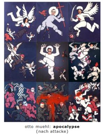 De omstreden Oostenrijkse kunstenaar Otto Mühl maakte eind jaren ’90 een kunstwerk met de naam ‘Apocalyps’. Op het doek was een dertigtal naakte personen afgebeeld, waarvan een aantal aan het masturberen en ejaculeren was. Voor de gezichten van die personen waren foto’s van bekende en minder bekende personen gebruikt (oa. moeder Theresa en Jörg Haider). Ook Meischberger, bestuurder van de politieke partij FPÖ, was op deze wijze afgebeeld, met een balkje voor zijn ogen. Hieronder een foto van dat kunstwerk, dat zoveel weerstand opriep dat het door een bezoeker van de tentoonstelling met rode verf werd beklad. Meischberger was ondanks deze bekladding nog steeds min of meer herkenbaar, en eiste dat het schilderij niet langer tentoongesteld zou worden. De Oostenrijkse rechter – niet de grootste voorvechter van vrijheid van meningsuiting – wees die vordering toe. Meischberger kreeg zelfs een schadevergoeding.
