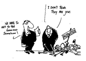Een cartoon van de Arabisch-Europese Liga (AEL) refereerde aan de suggestie dat joden de holocaust (voor hun eigen gewin) hebben verzonnen. Op de cartoon staan twee orthodoxe Joden naast een aantal lijken bij een bordje ‘Auswitch’. De een zegt tegen de ander, die een optelling bestudeert: ‘I don’t think they are Jews’, waarop de ander met het papier antwoordt: ‘We have to get to the 6000000 somehow.’ Er volgde een strafzaak wegens belediging tegen de AEL, die de cartoon op haar website plaatste.