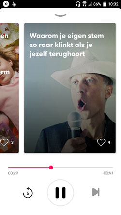 Een artikel krijgt een korte inleiding door een van de sprekers, waarna het artikel door een tweede stem wordt voorgelezen. Je kunt dus slechts beperkt via knoppen navigeren, maar kunt altijd swipen tussen de onderwerpen.