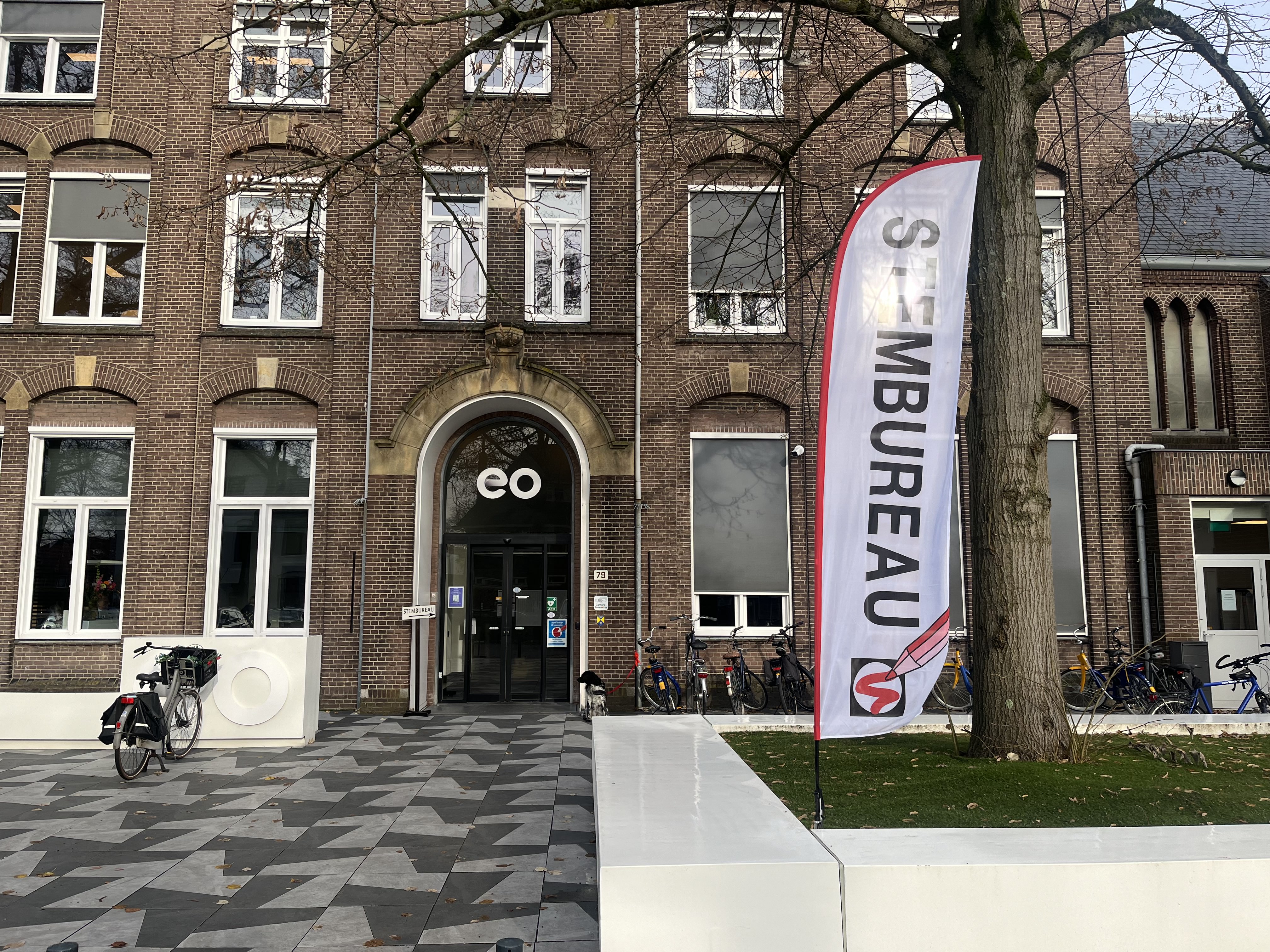 Aan de linkerzijde van het pand bevinden zich de kantoorruimten van de EO, aan de rechterzijde is een stemlokaal ingericht. Het is een donkere ruimte, het rolgordijn is naar beneden gelaten. Op woensdag aan het einde van de ochtend zijn het vooral veertigers, vijftigers en ouderen die komen stemmen.